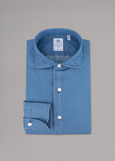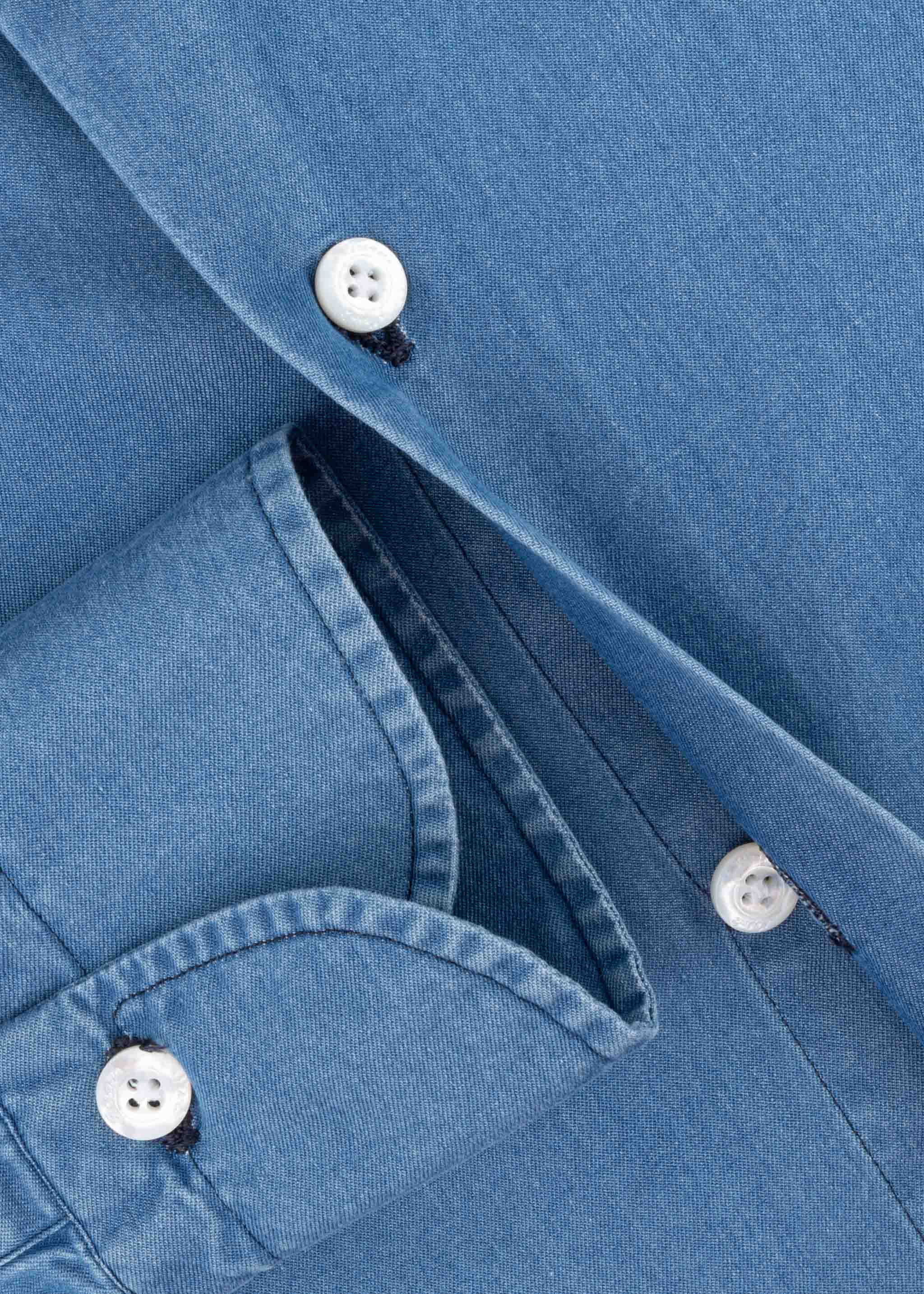 Denim shirt 'Zante' by Finamore made of soft cotton, pointed collar, full button placket, long sleeves with buttoned cuffs, rounded hem.