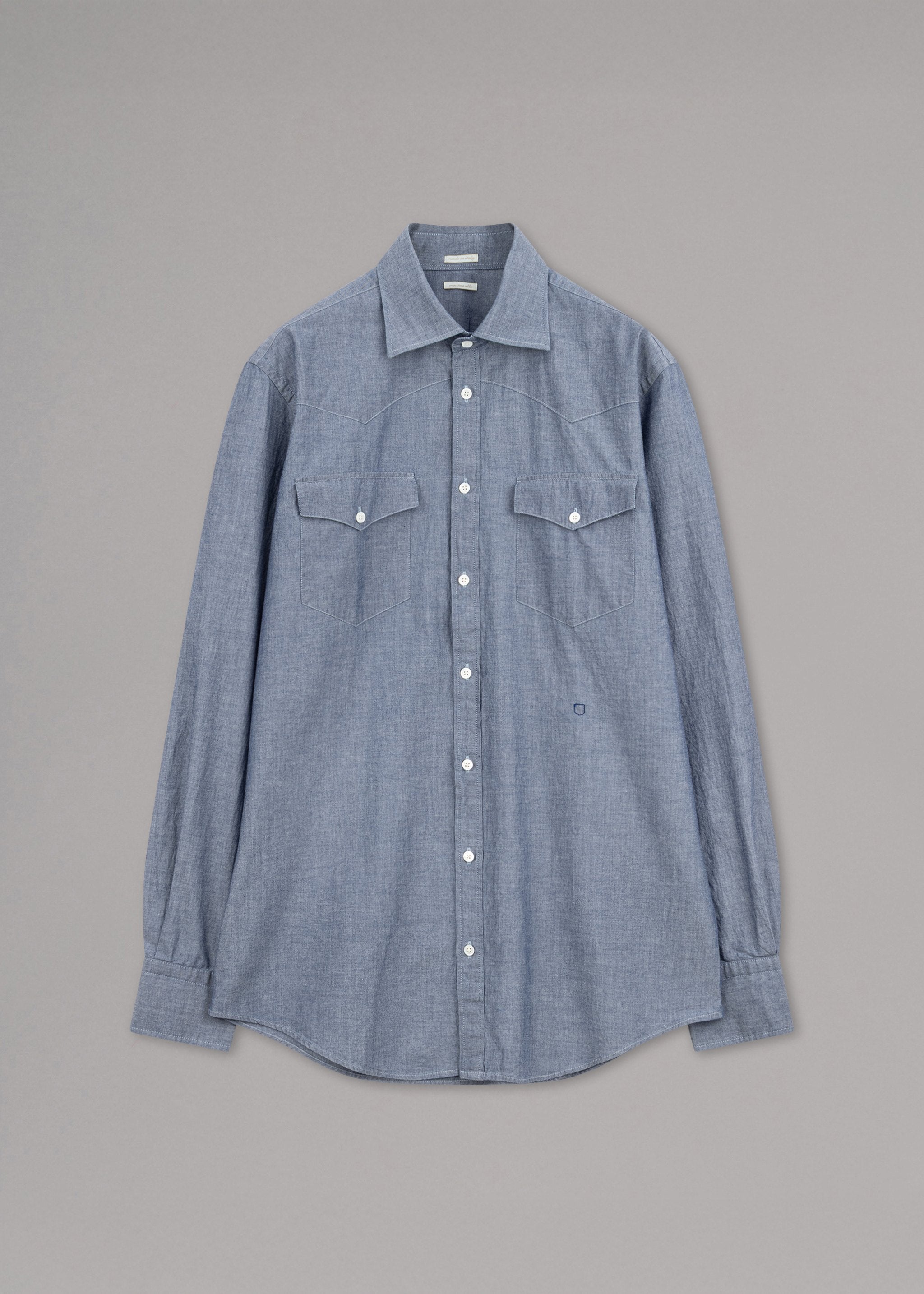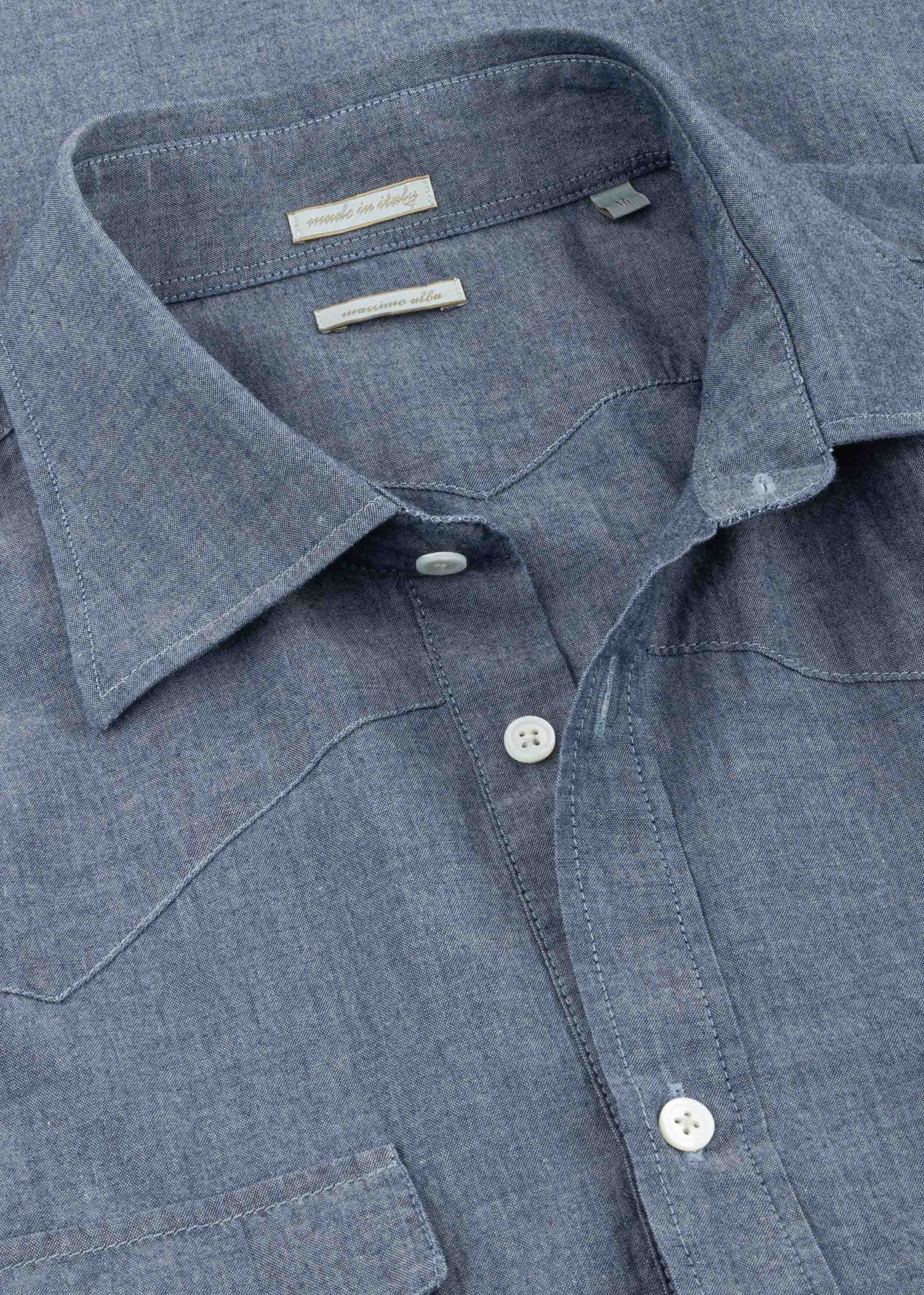 Western shirt 'Arizona' by Massimo Alba made of fine cotton, classic collar, long sleeves with button cuffs, full mother-of-pearl button placket, two chest pockets with flaps, pointed chest and back yoke, darts in the back, rounded hem.