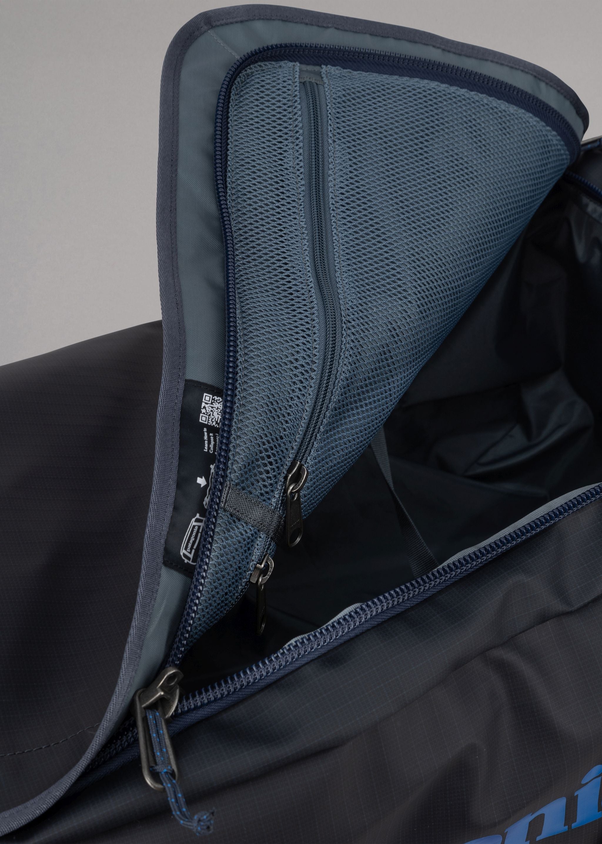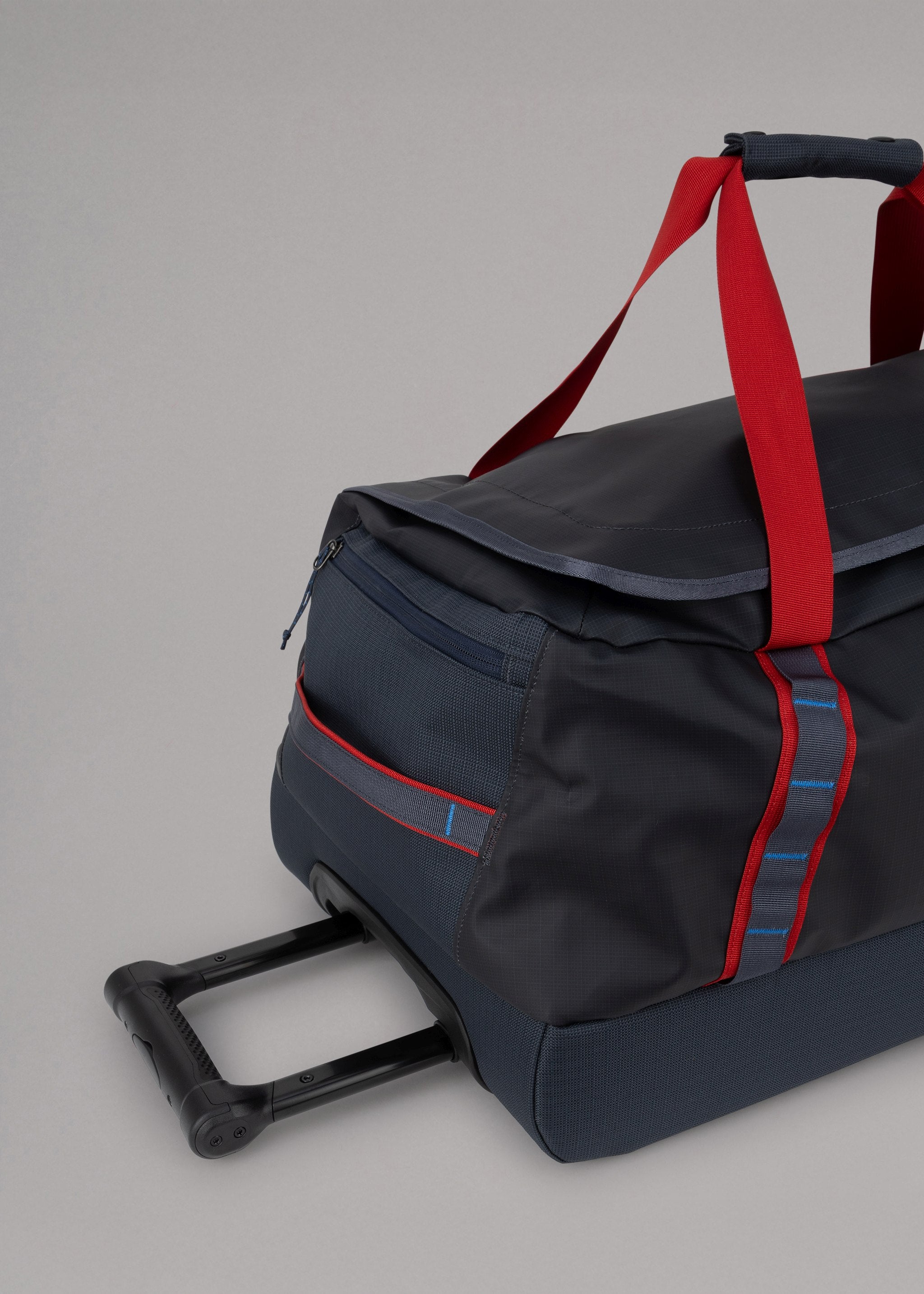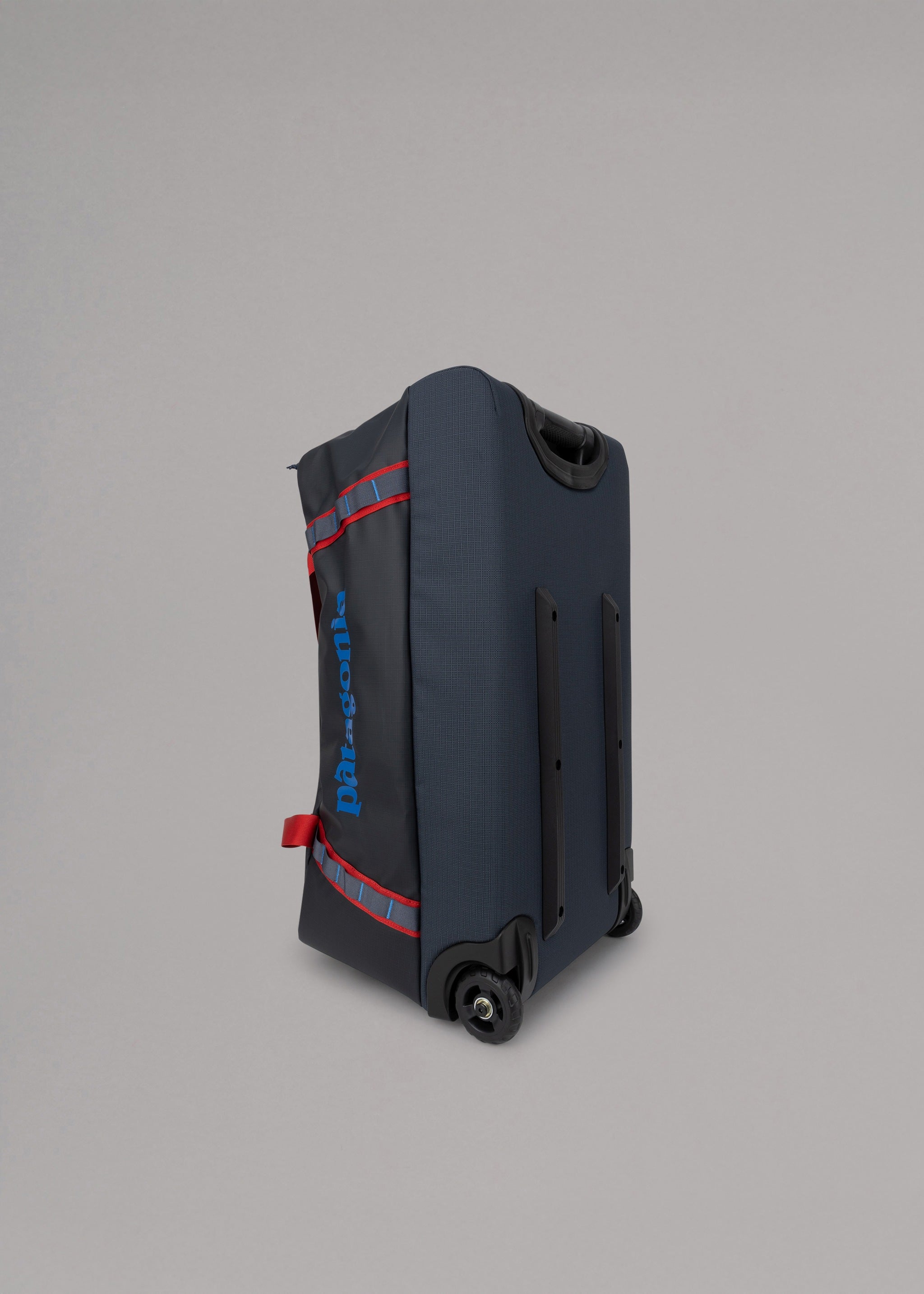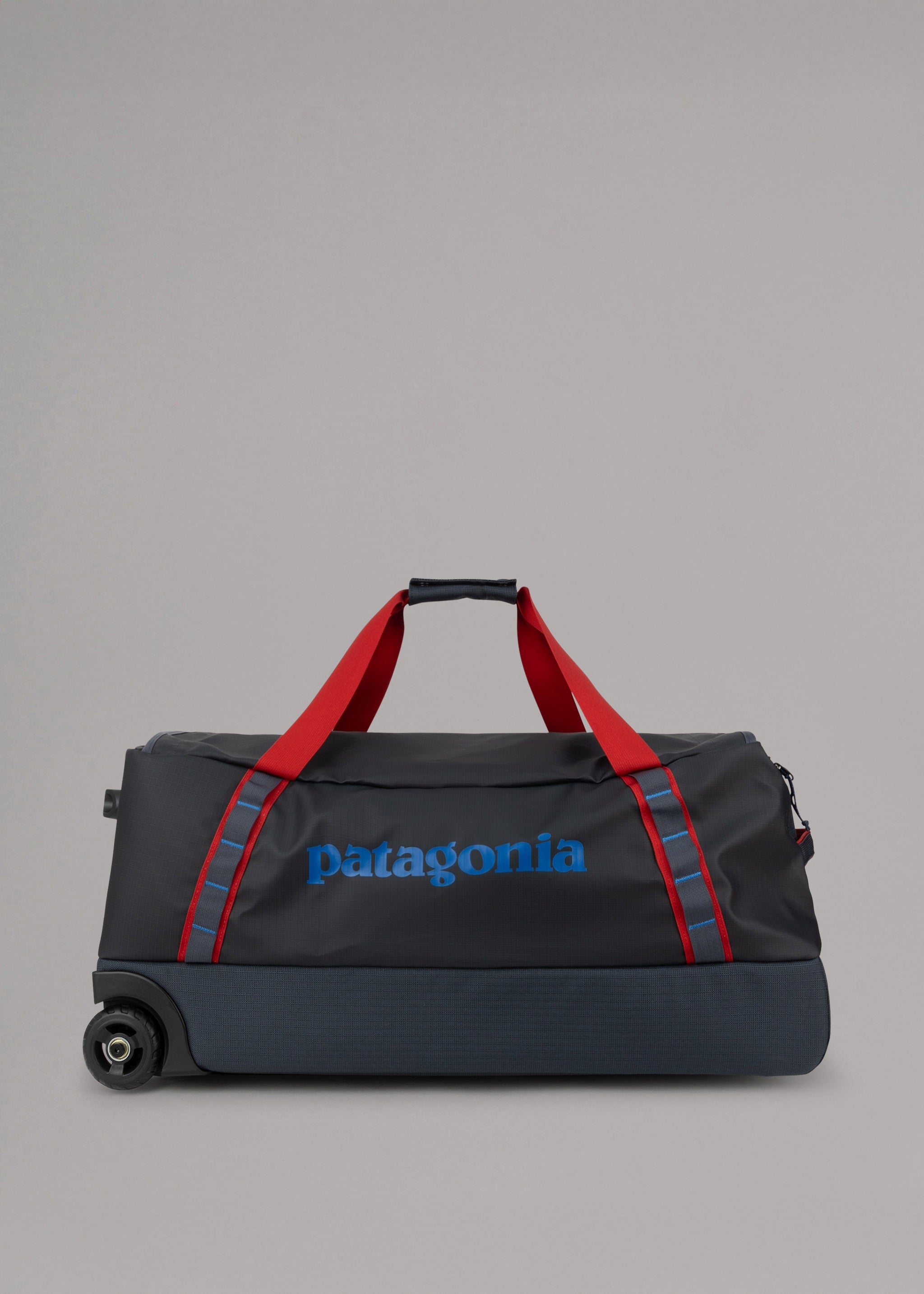 Robust travel bag 'Black Hole Wheeled Duffel' by Patagonia made from 100% weatherproof recycled material, main compartment with large opening and compression straps, side pocket with zip, mesh pockets, carrying handles, large wheels, telescopic handle.