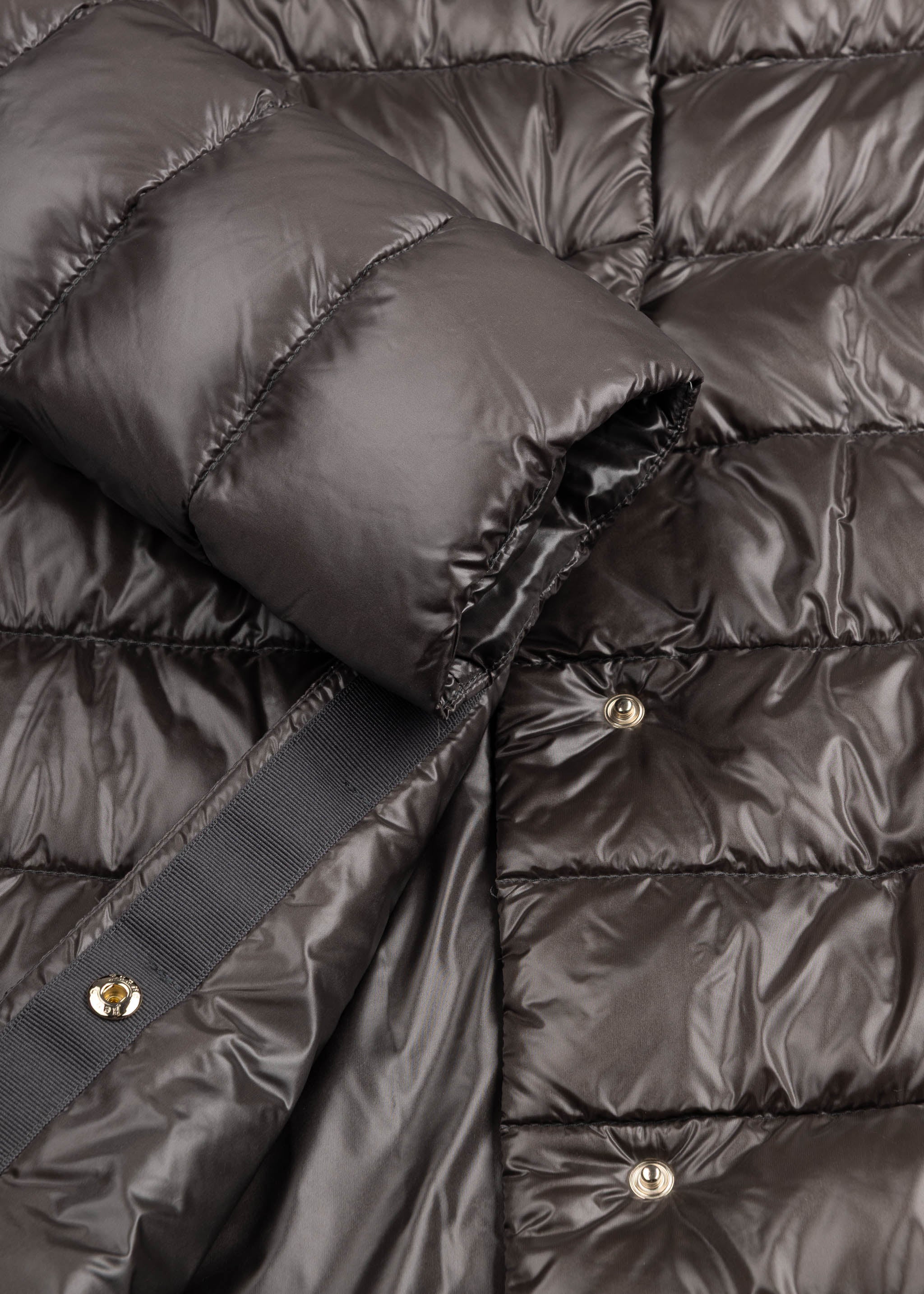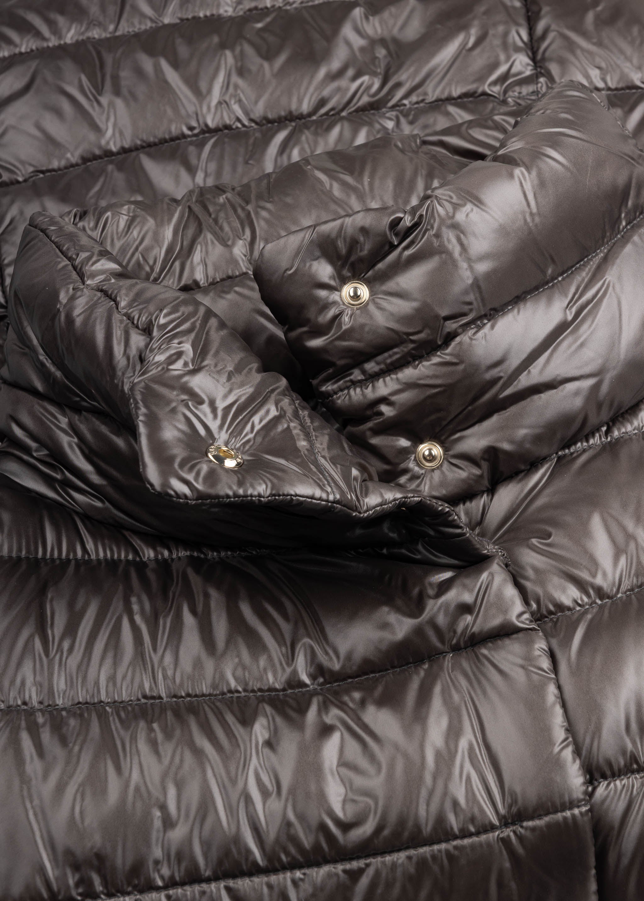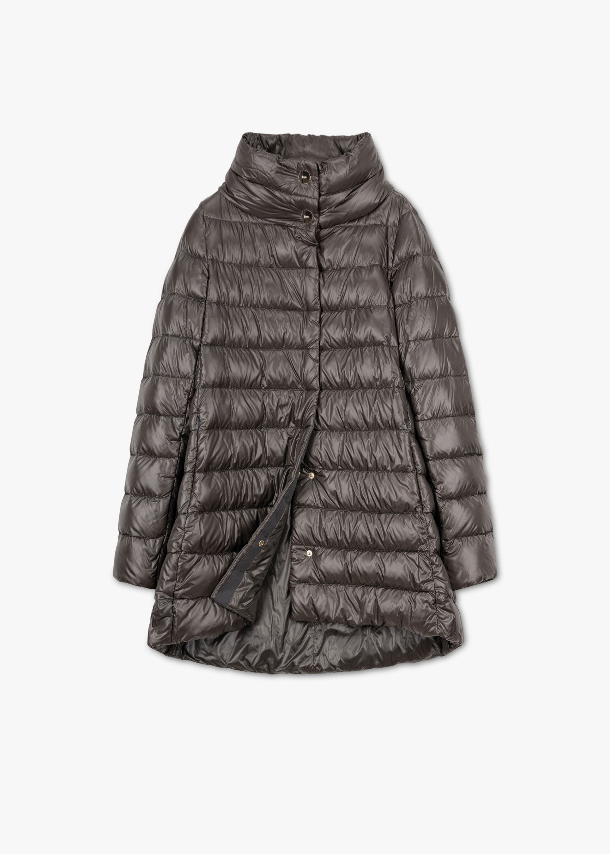 Short coat by Herno, stand-up collar, concealed snap button placket, long sleeves, side pockets with zip, slightly shortened hem at the front, lined finish.