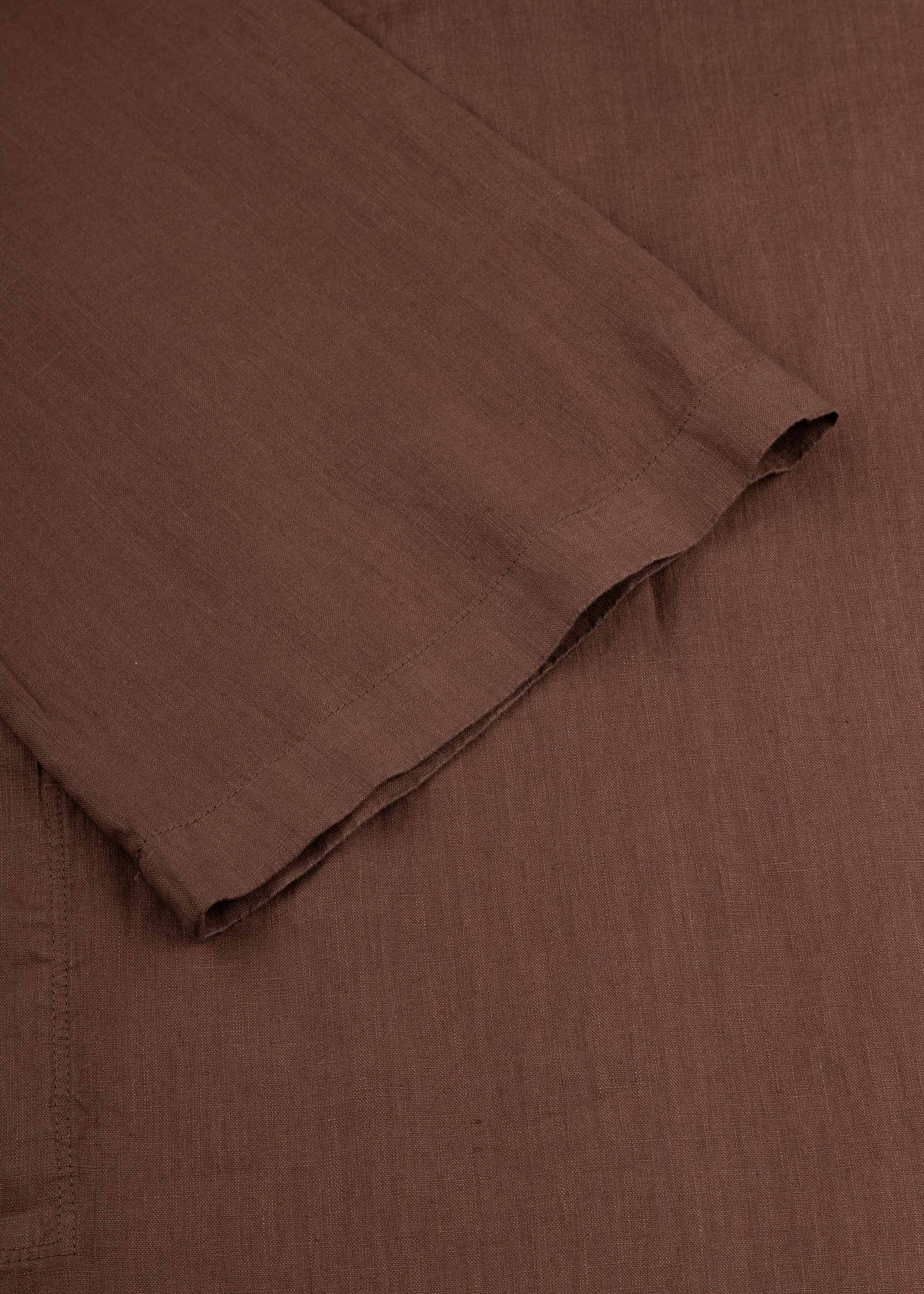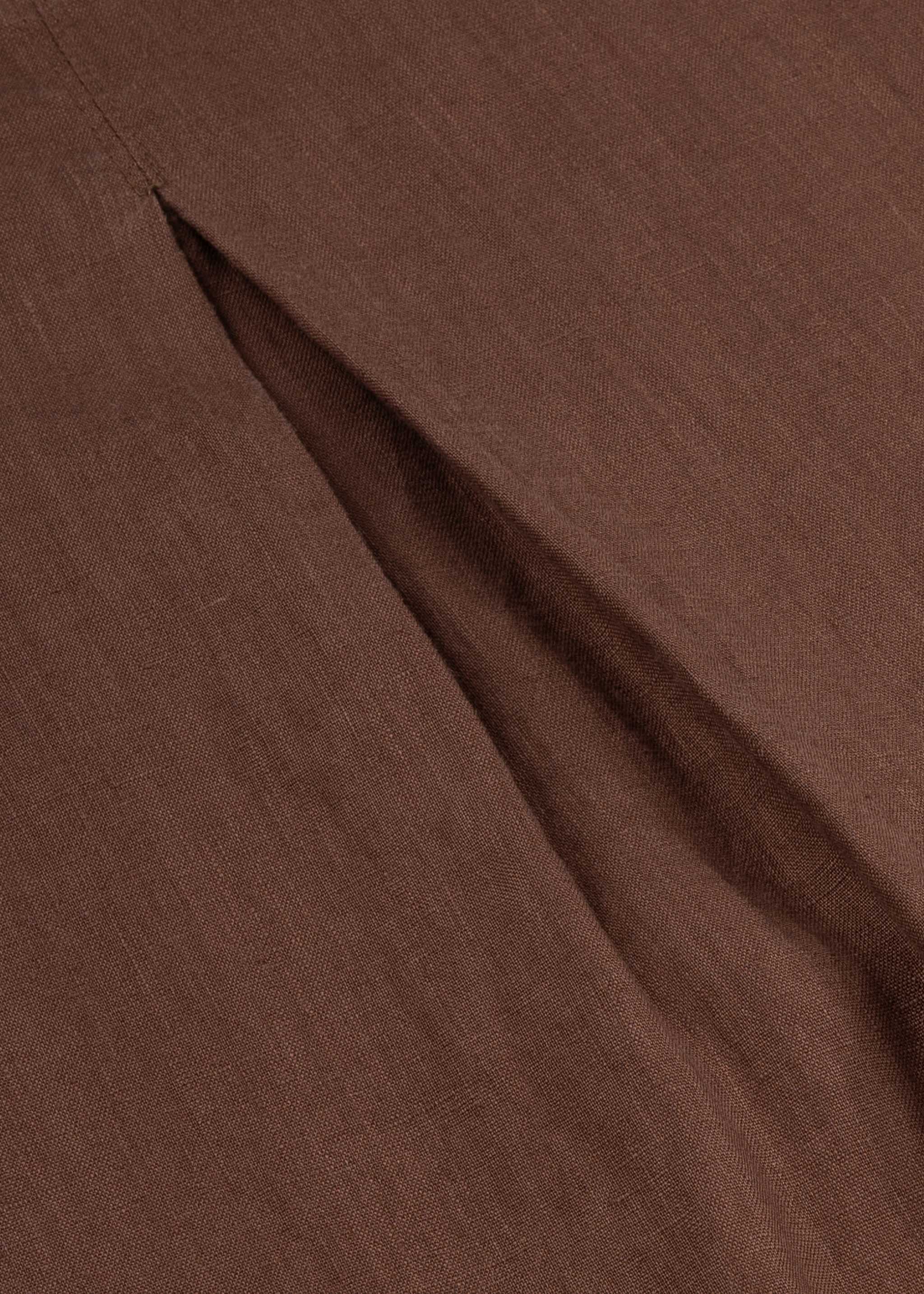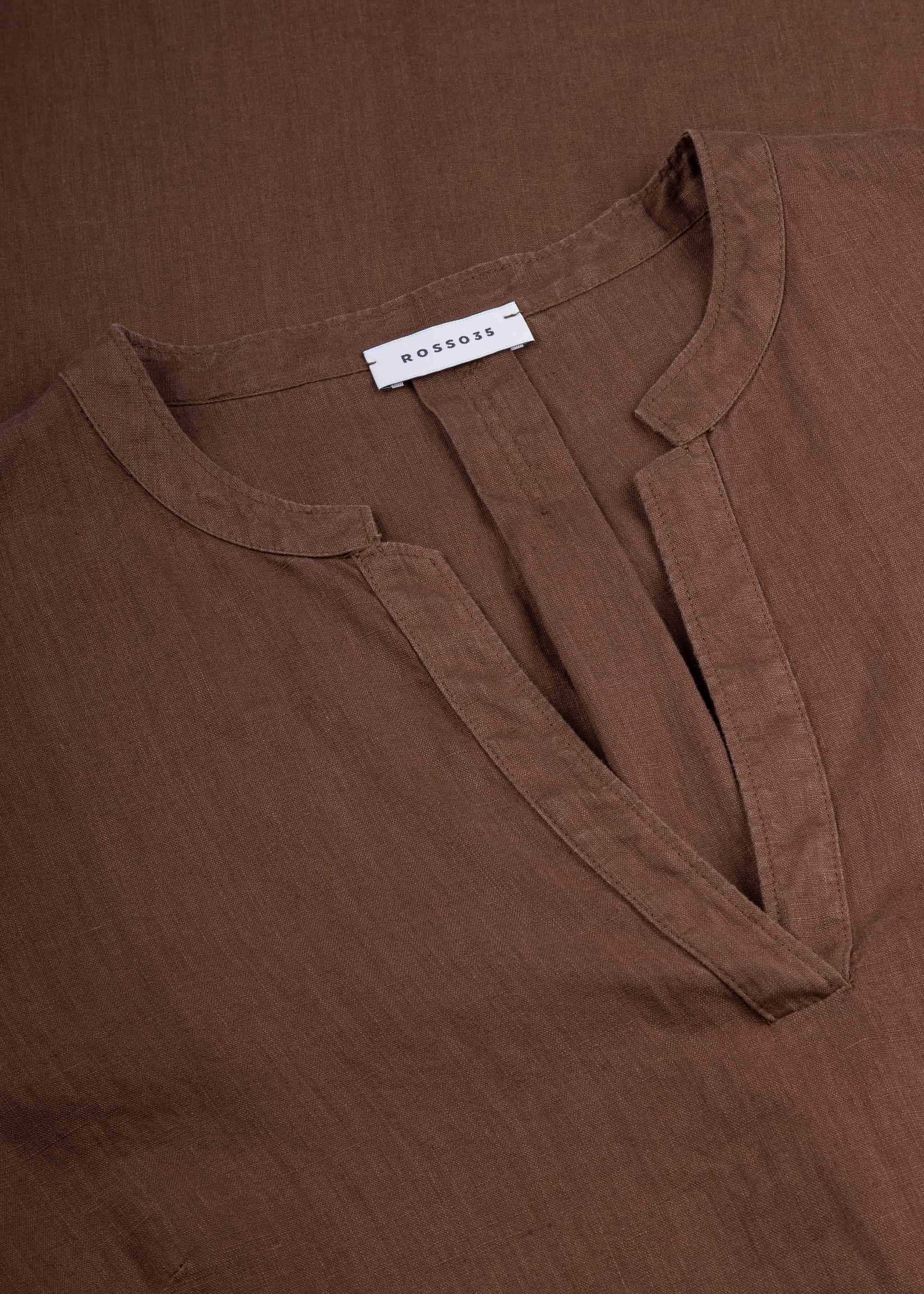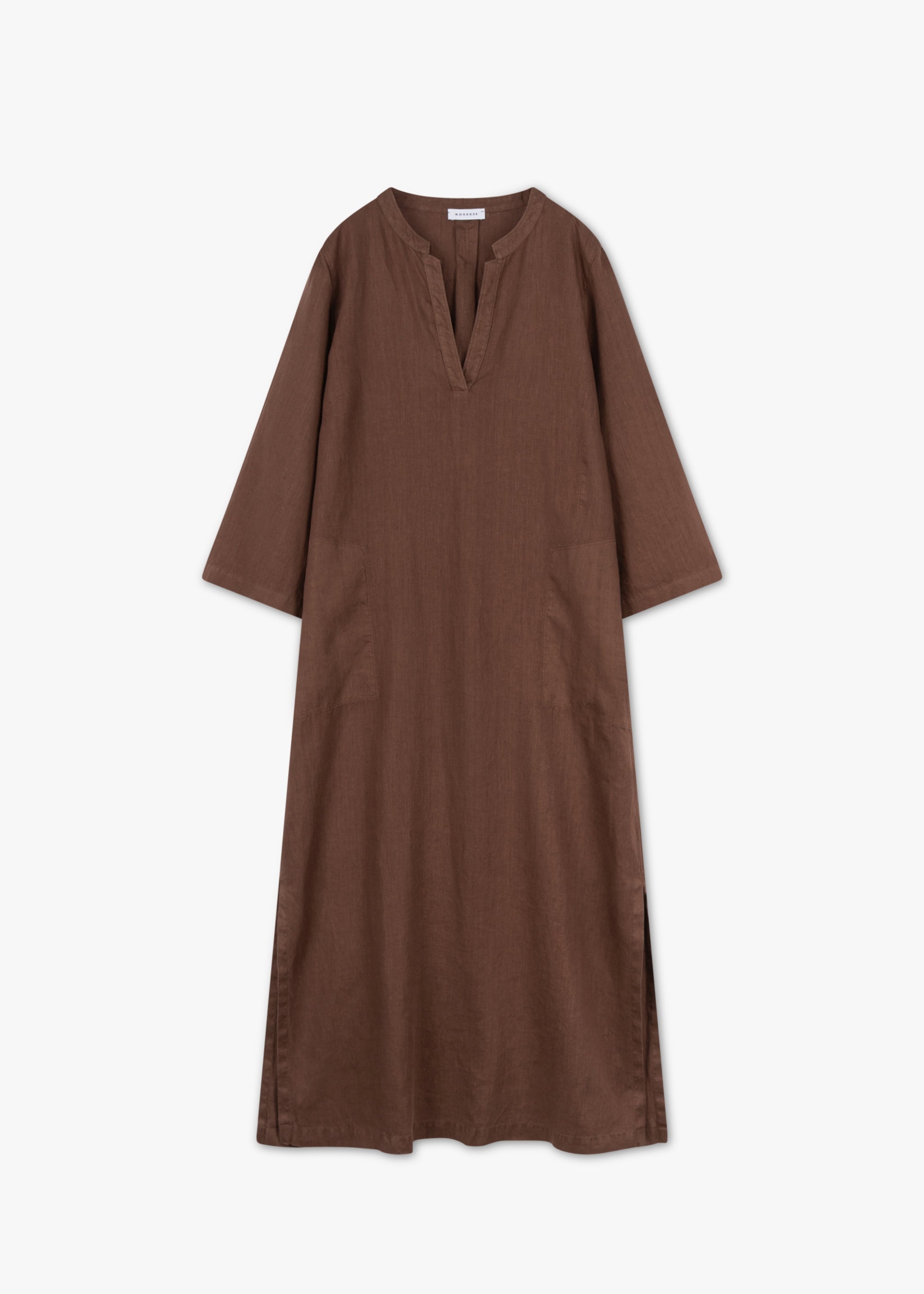 Maxi dress by Rosso35, stand-up collar with V-neck, narrow shoulders, 3/4 sleeves, box pleat in the back, side pockets, straight hem with side slits.