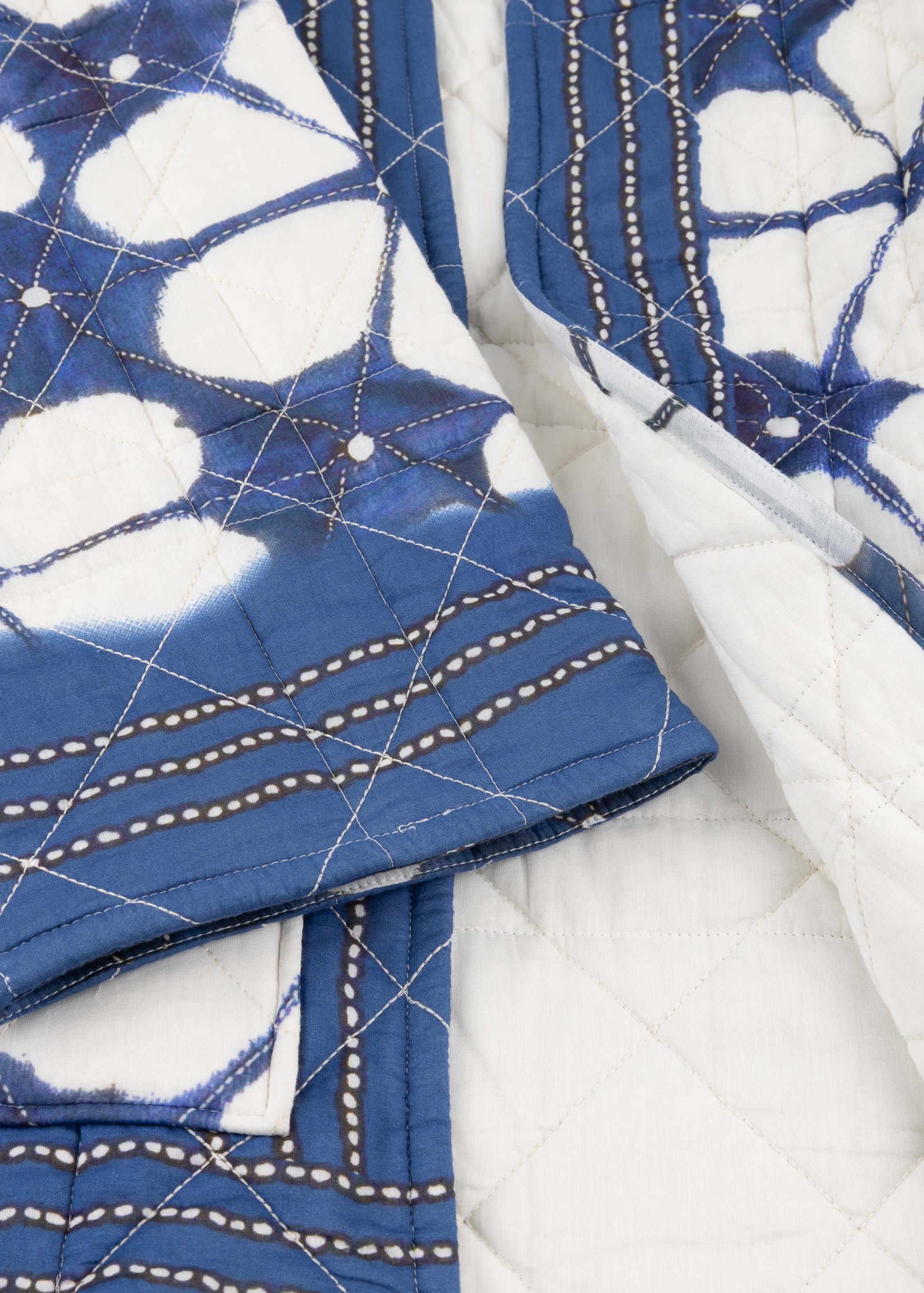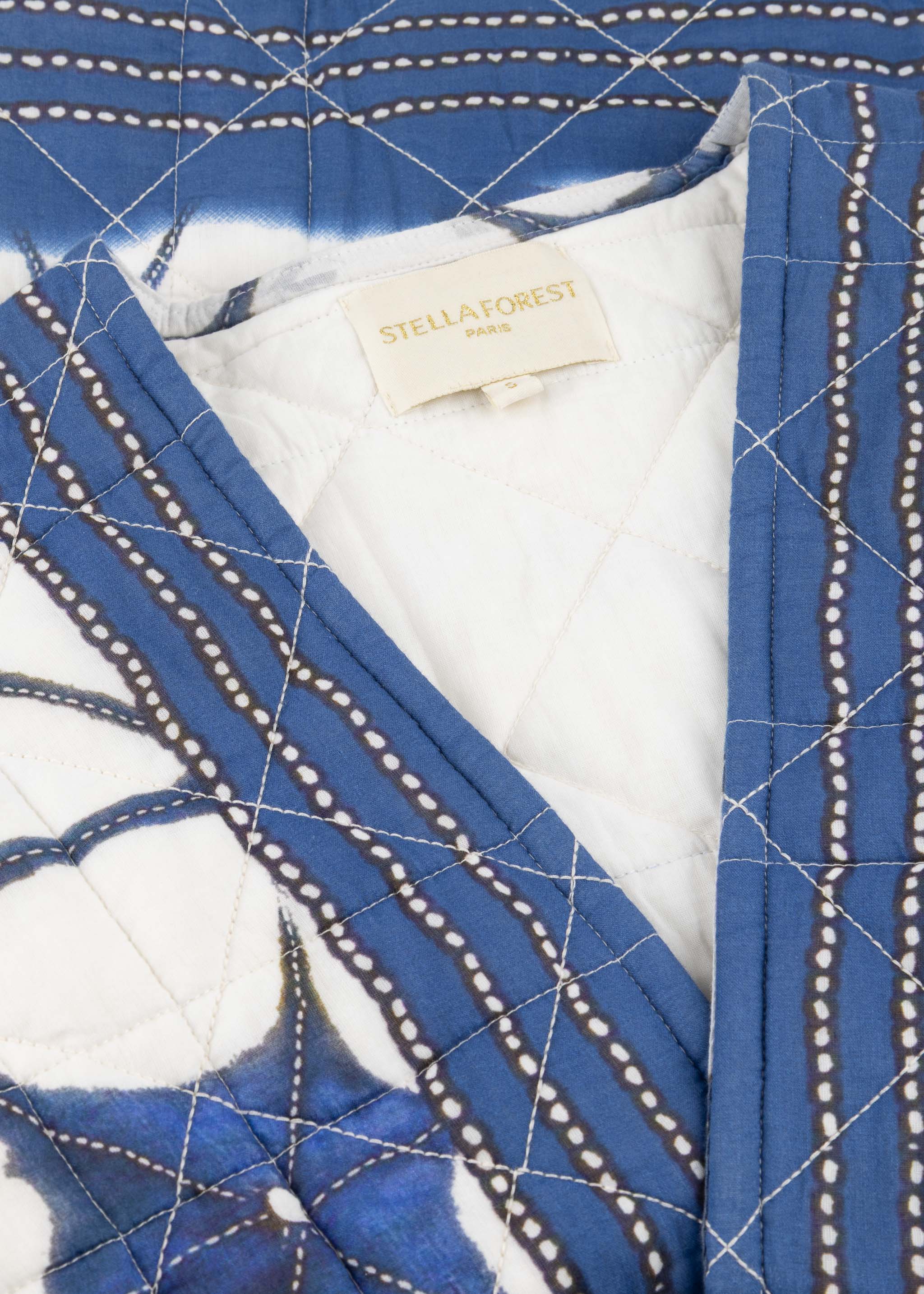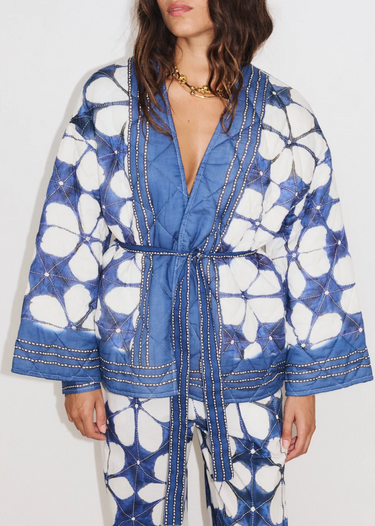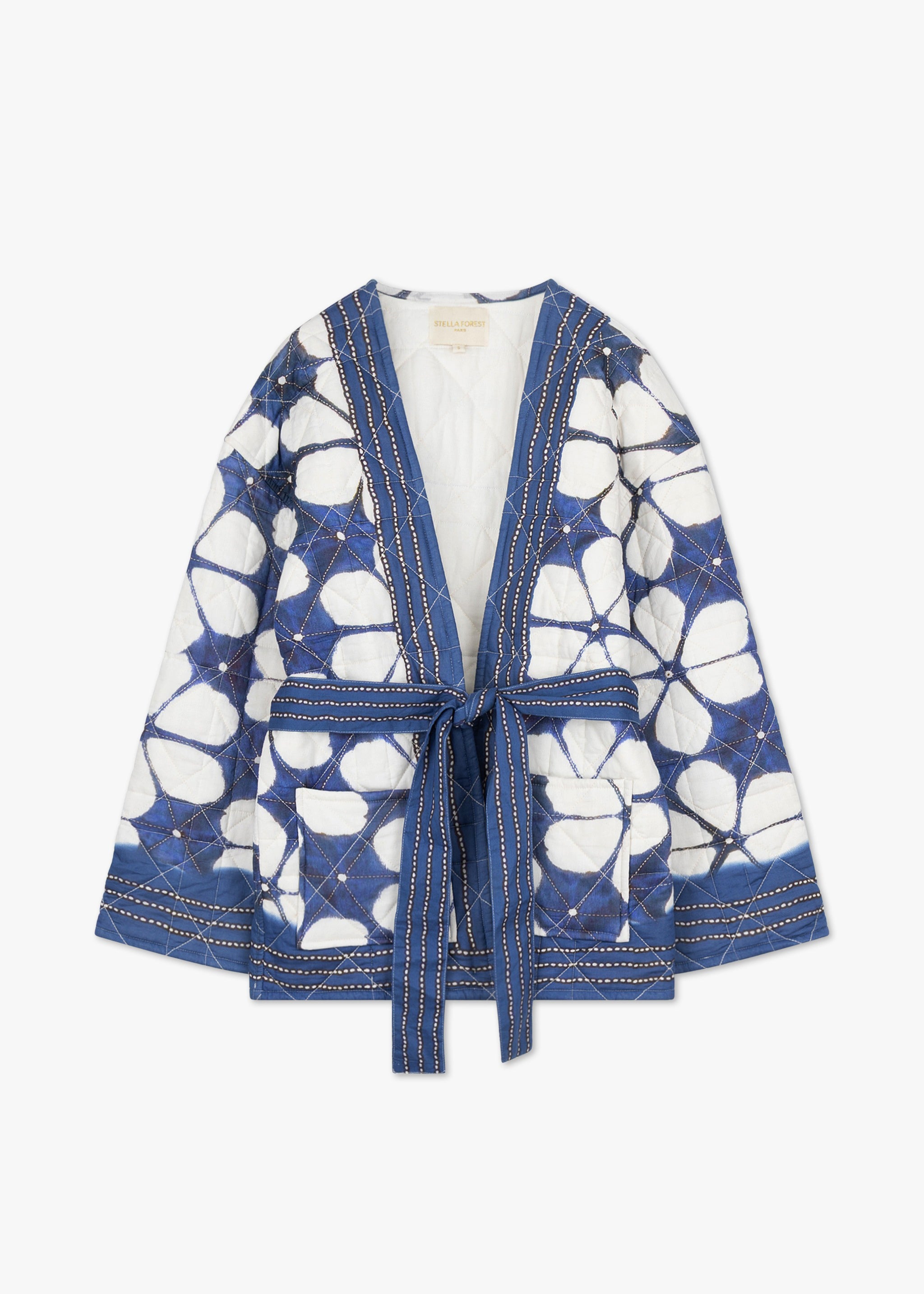 Patterned 'Lotus' jacket by Stella Forest in patchwork cotton, wide sleeves, open closure, tie belt, two patch pockets, straight hem, lined finish, soft feel.