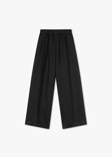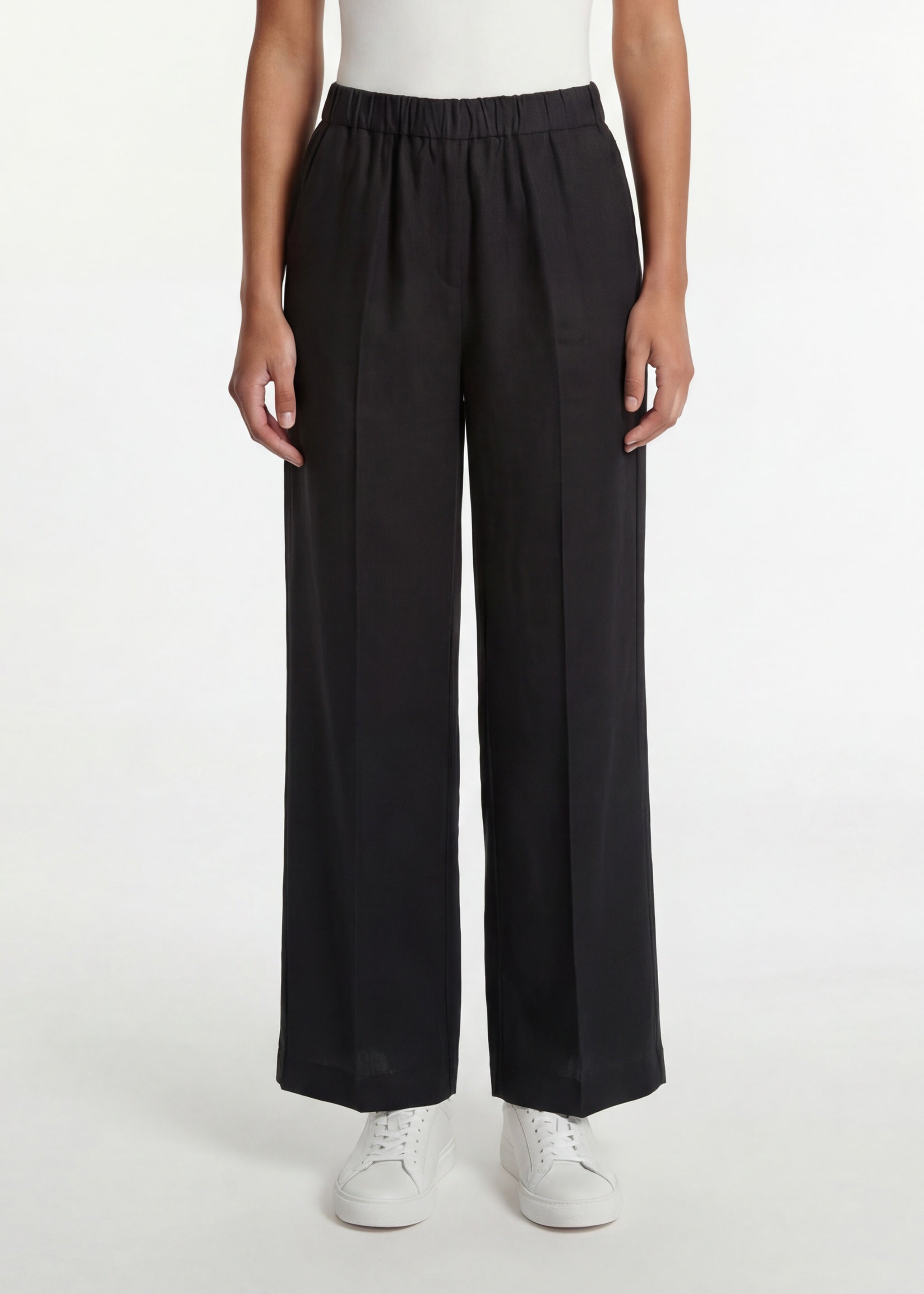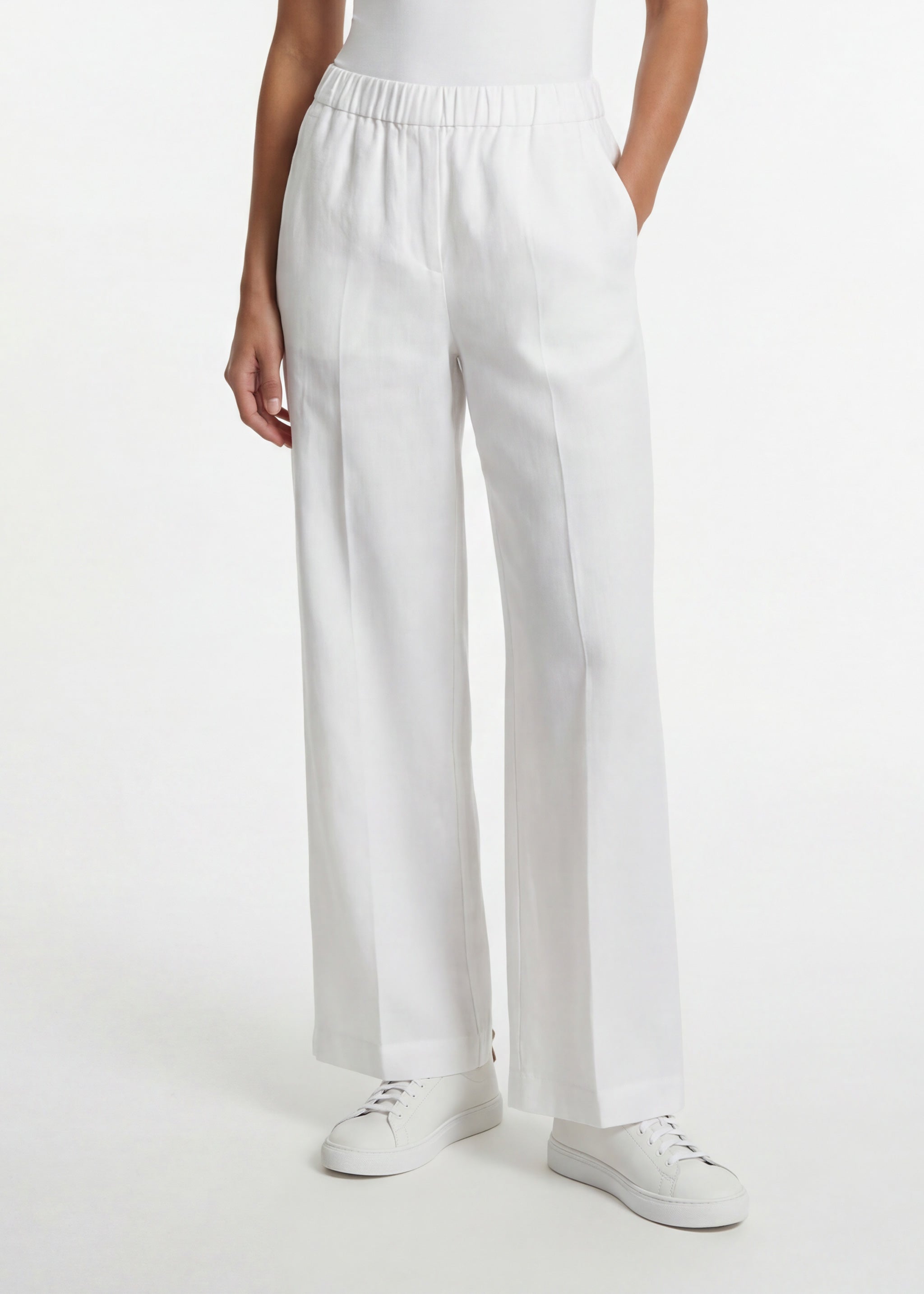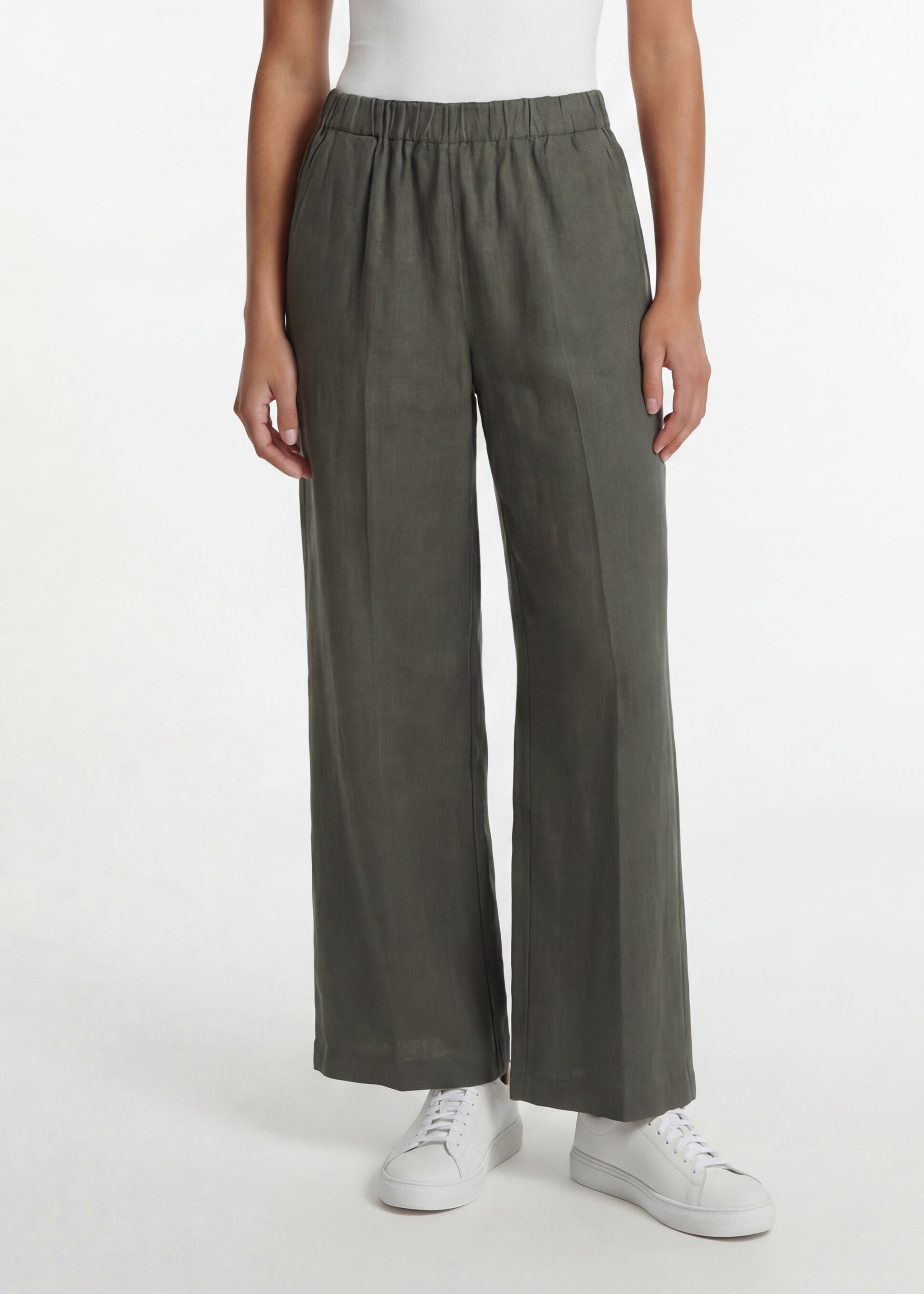 Knöchellange Hose von Rosso35 aus Leinen mit weitem Bein, elastischer Bund, Bügelfalten, seitliche Eingriffstaschen, aufgesetzte Gesäßtaschen.