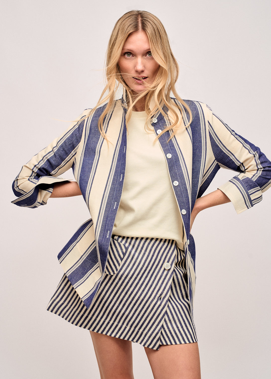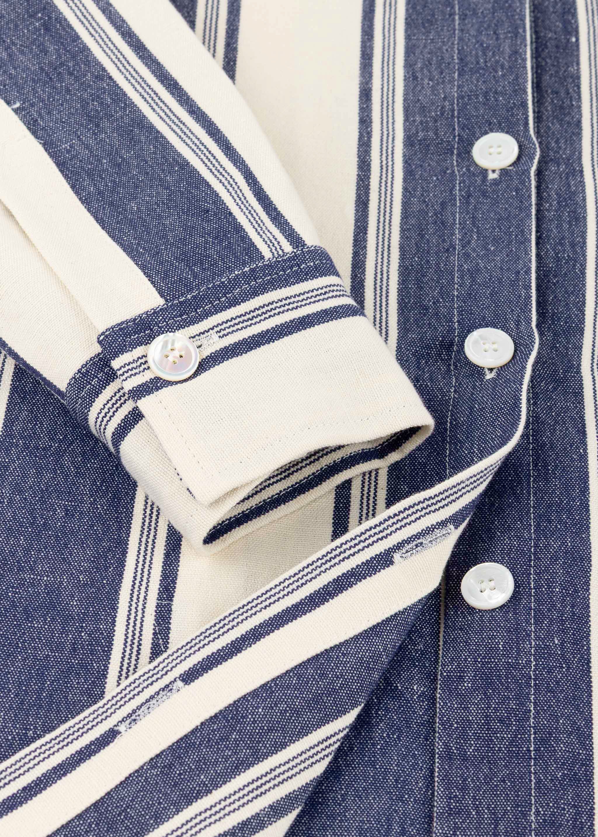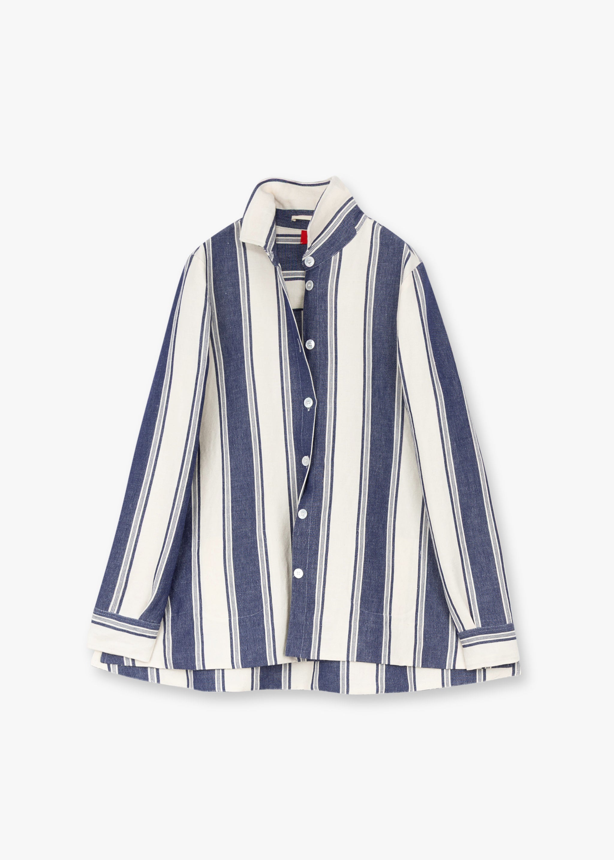 'Pocket Shirt' by PiaLea, pointed collar, back yoke, patch pockets inside, two short side slits, long sleeves with button cuffs, rounded hem extended at the back, unlined finish.