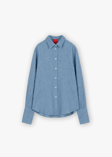'Woman Shirt' by Pialea, classic collar, long sleeves with wide button cuff, slightly rounded hem.