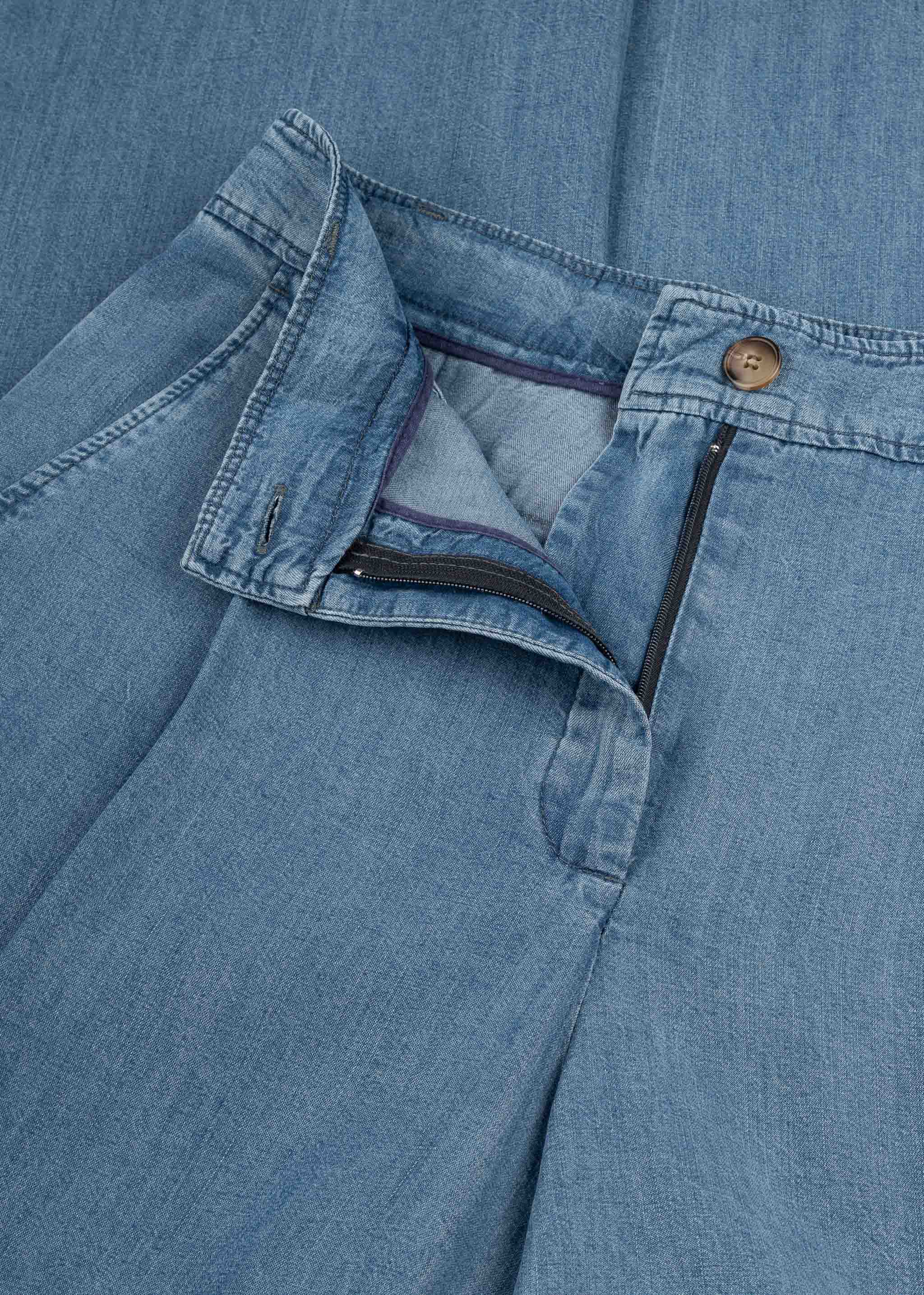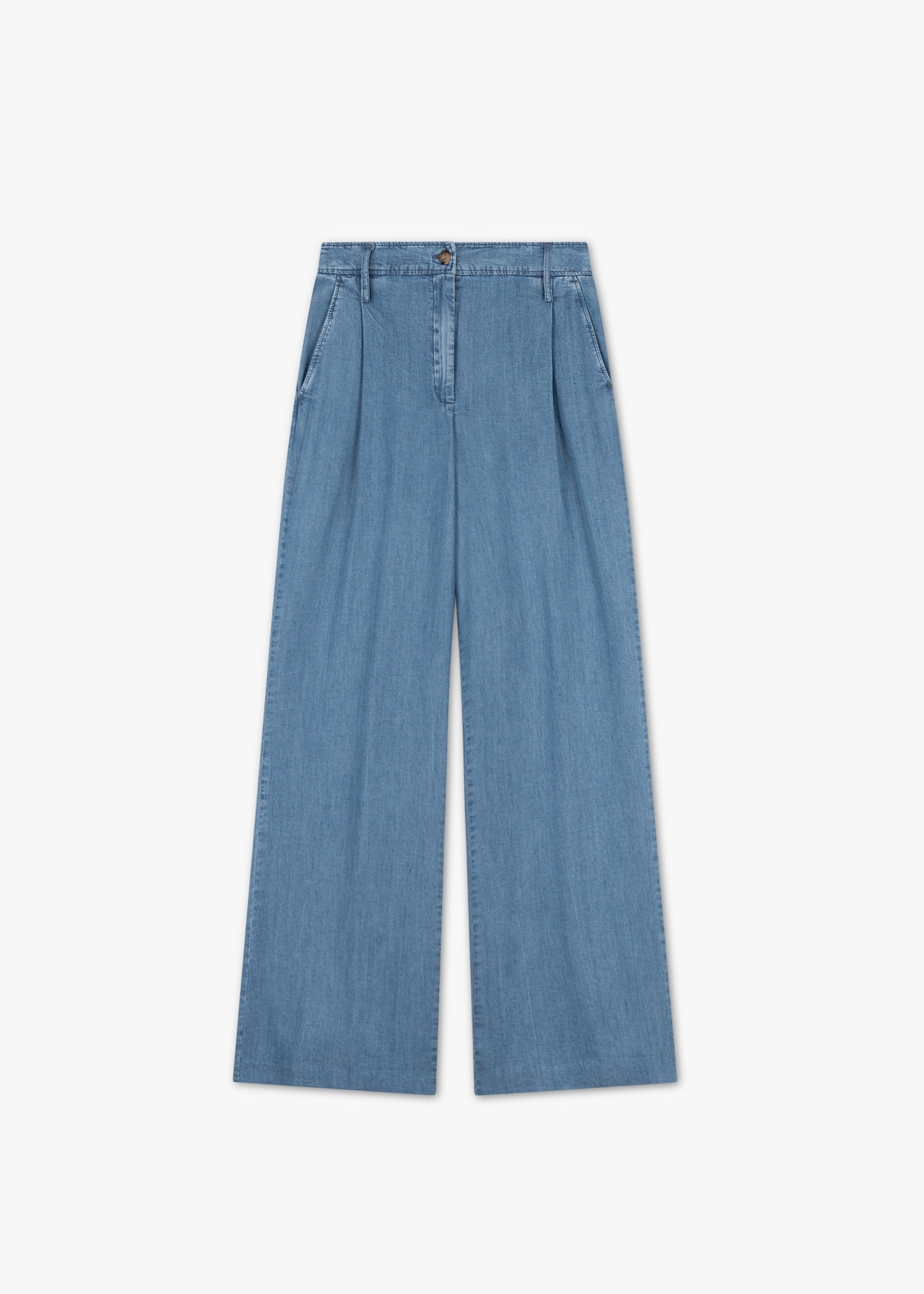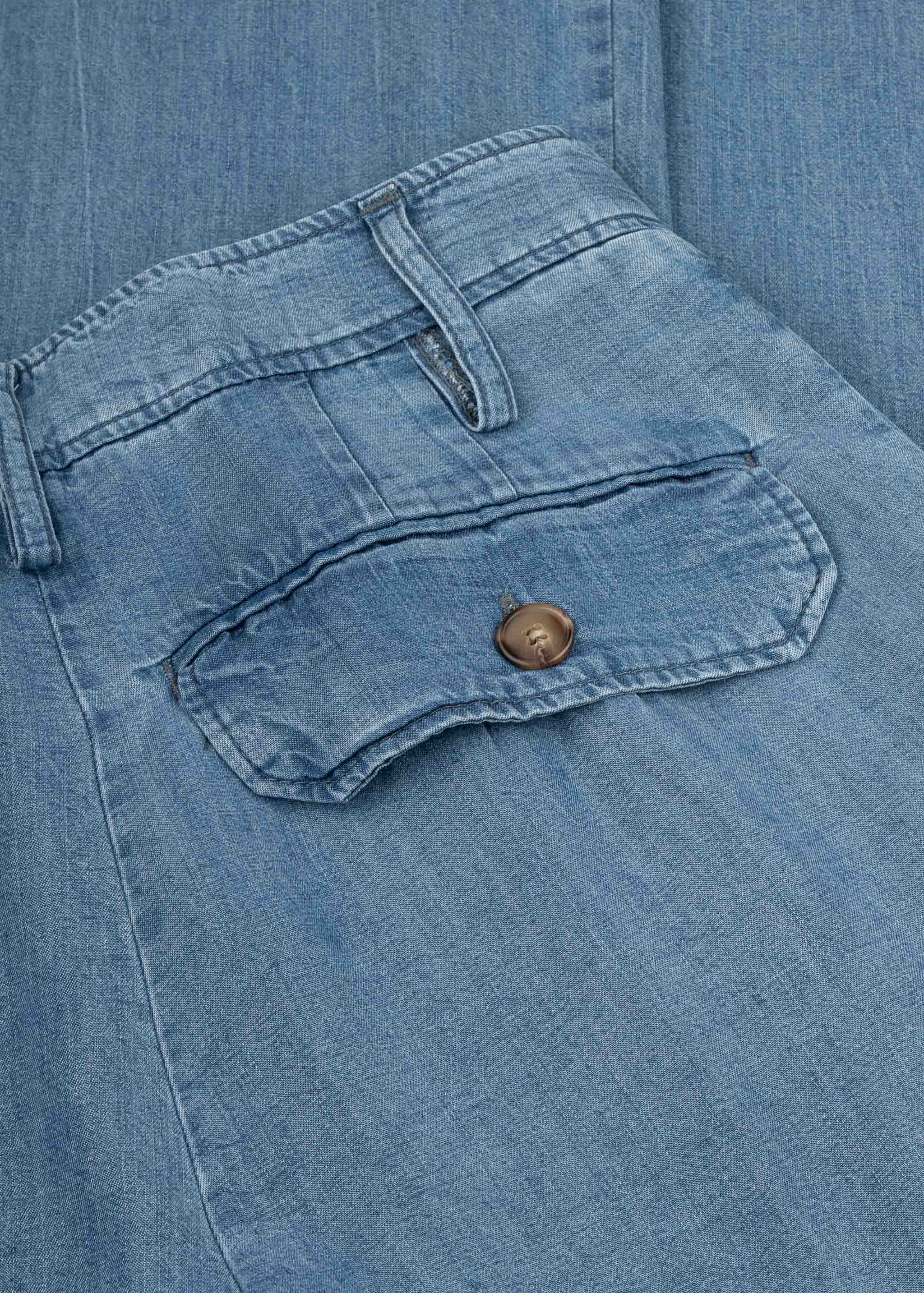 Ultralight trousers 'Ginger' by Kiltie made of fine Tencel in a denim look with wide leg, belt loops, button and zipper, waist darts, pleats, one back pocket with flap.