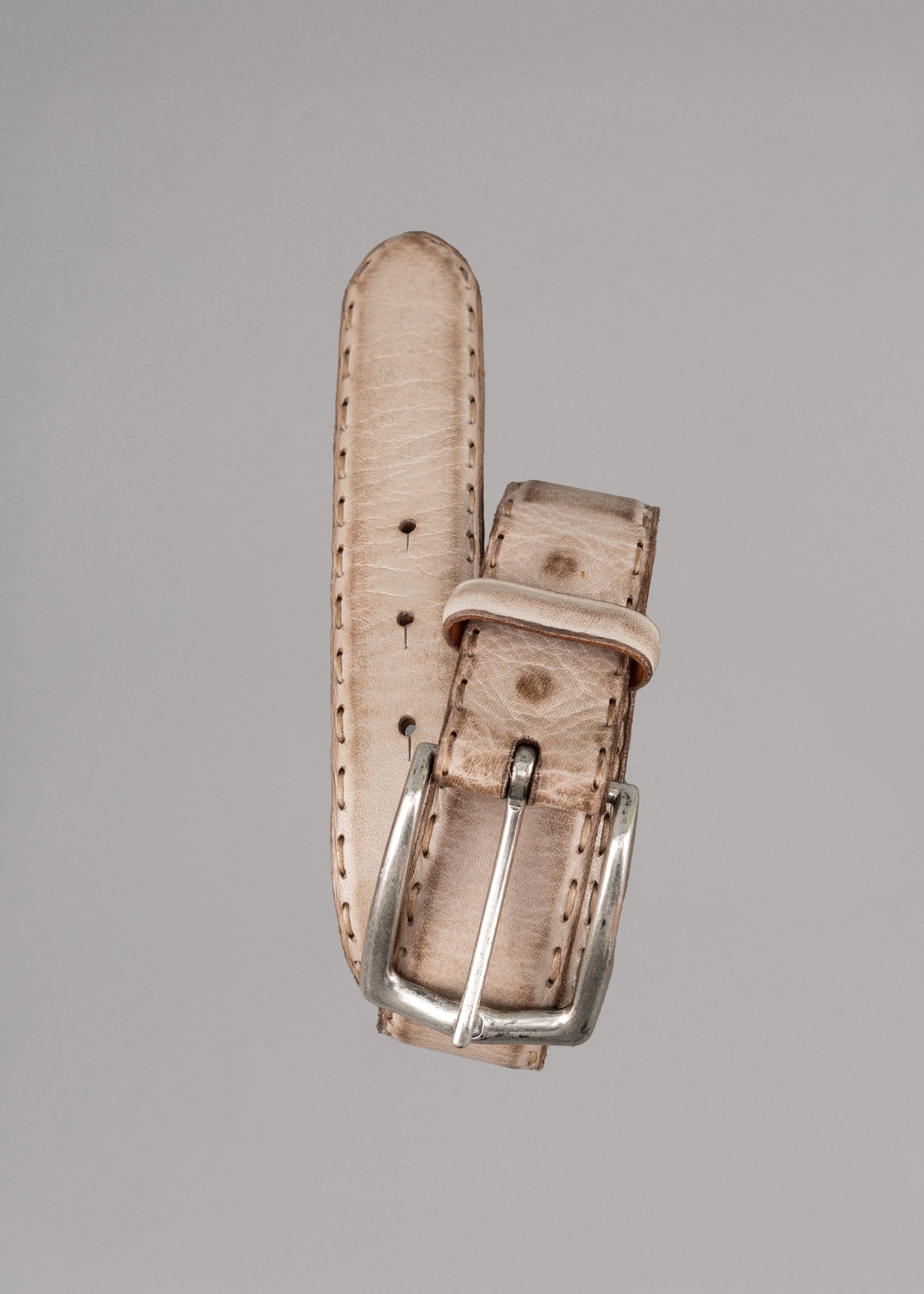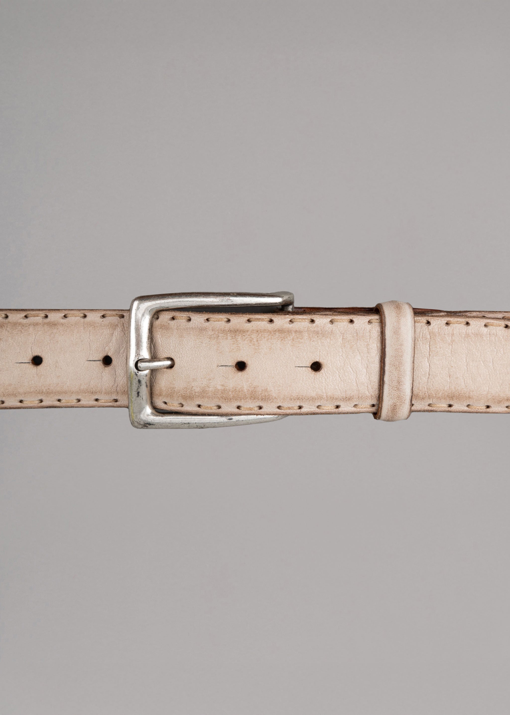 Heller Ledergürtel mit Vintage Behandlung von Reptile's House, silberne Schnalle und Ziernähte.