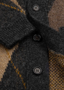 Lockere Rautenstrickjacke 'Langdale' von Universal Works aus einer weichen Wollmischung, V-Ausschnitt, Knopfleiste, lange Ärmel, zwei Leistentaschen, gerippte Abschlüsse, gerader Saum.