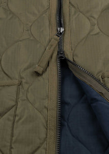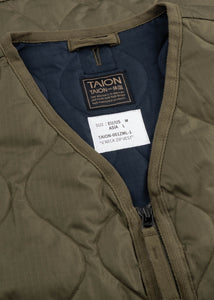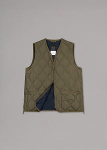 Leichtes Gilet von Taion, V-Ausschnitt, Zwei-Wege-Reißverschluss, zwei aufgesetzte Taschen, lange Seitenschlitze mit Reißverschluss, gerader Saum, gefütterte Bearbeitung.
