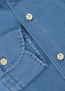 Slim-Fit Hemd von Borriello aus weicher Baumwolle in Denim Optik, Haifischkragen, durchgehende Knopfleiste, lange Ärmel mit Knopfmanschette, abgerundeter Saum.