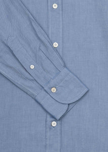 Hellblaues Hemd von Finamore aus sehr leichtem Flanellstoff, klassischer Kragen, Knopfleiste mit hellen Perlmuttknöpfen, lange Ärmel mit je zwei Knöpfen und ein abgerundeter Saum.