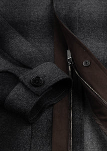 Hochwertige Jacke von Maurizio Baldassari aus weicher Loro Piana Merinowolle, klassischer Kragen mit Leder-Riegel, lange Ärmel mit Knopfmanschette, Zwei-Wege-Reißverschluss mit Druckknopf-Leiste und Leder Besatz, zwei aufgesetzte Taschen, eine Innentasche,  teilgefütterte Verarbeitung.