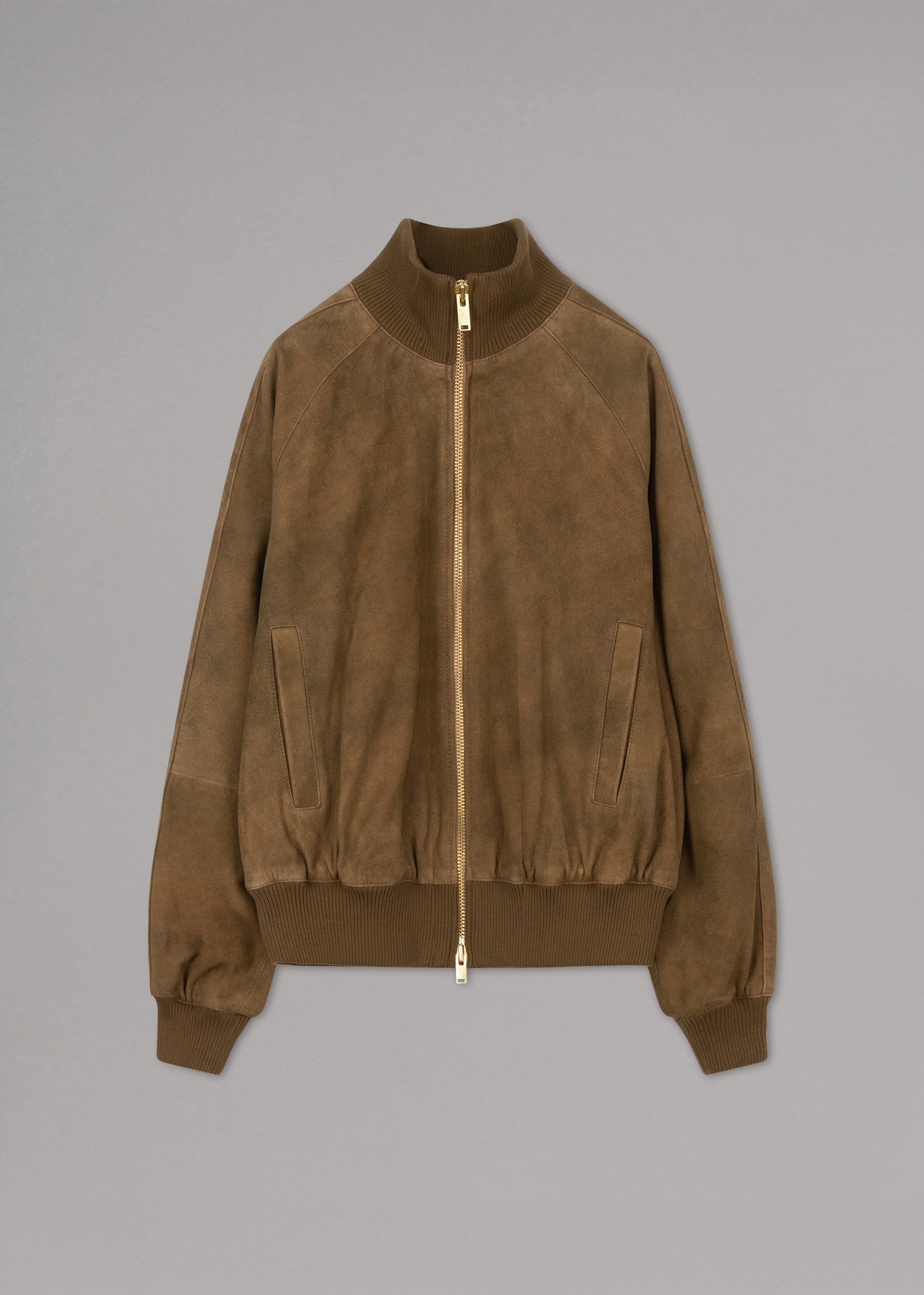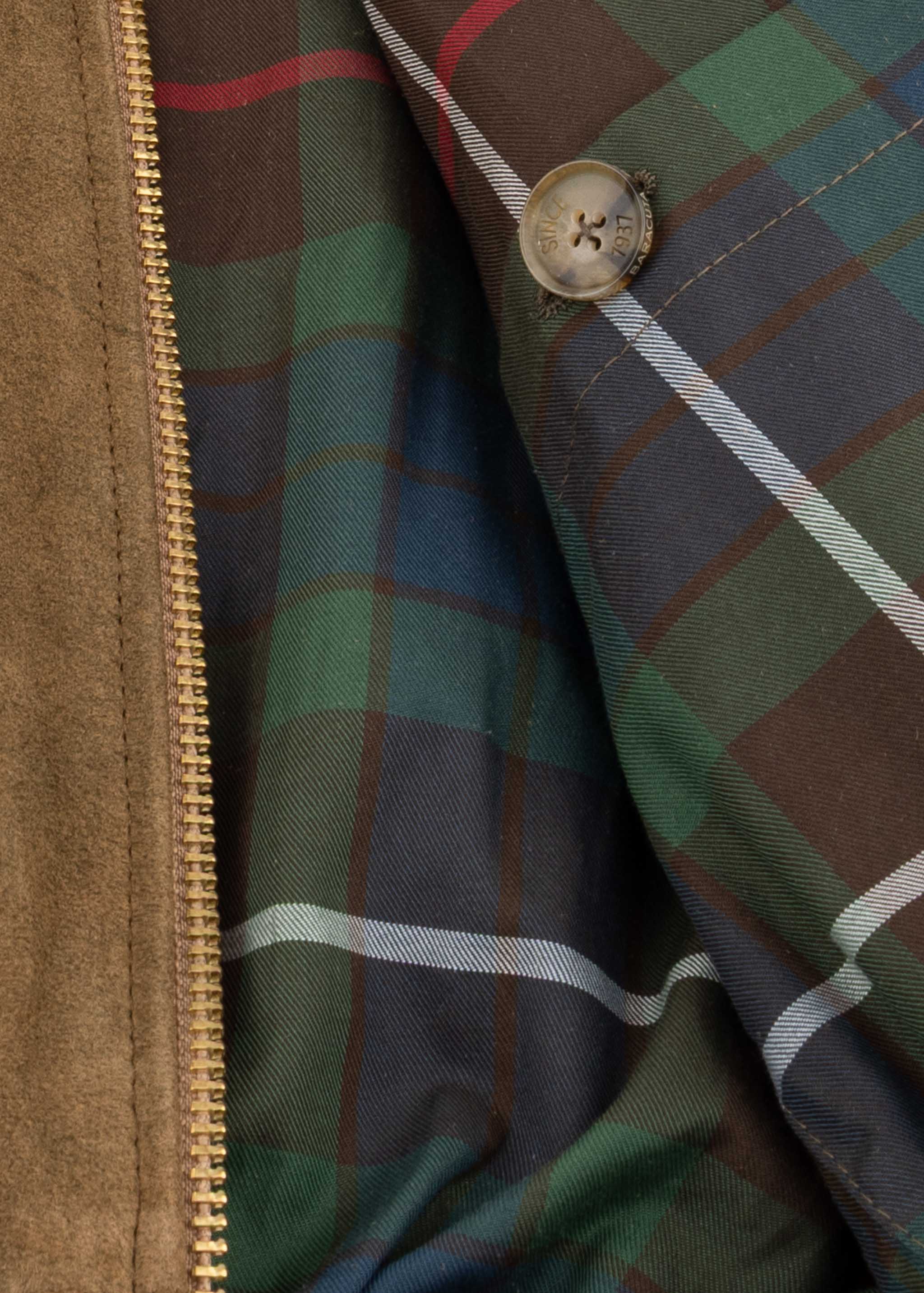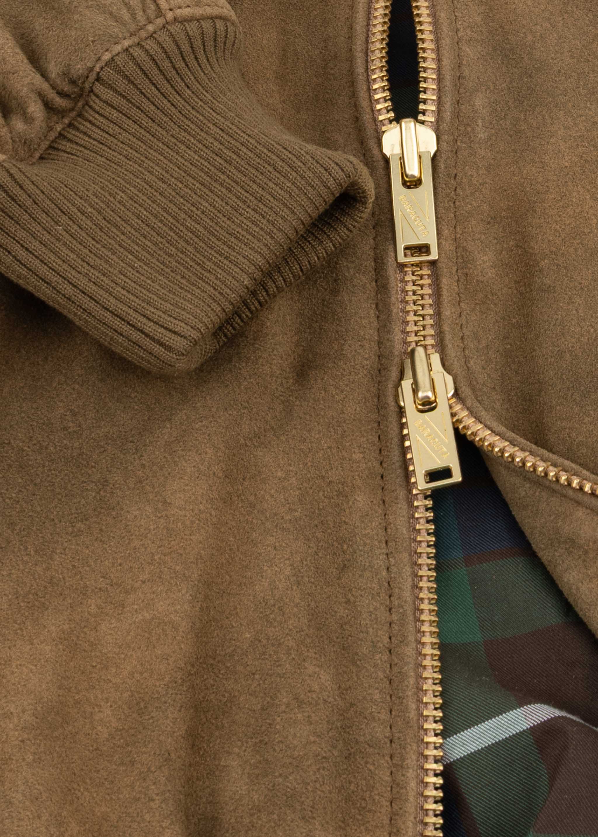 Lockere Bomber-Jacke von Baracuta aus weichem Verloursleder mit Vintage-Finish, Stehkragen, Zwei-Wege-Reißverschluss, Raglanärmel, seitliche Eingriffstaschen eine Innentasche, elastische Rippenbündchen, gerader Saum, Tartan-Futter.