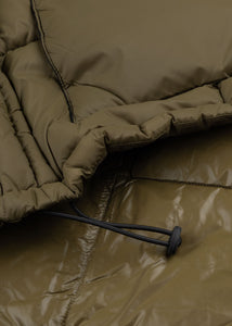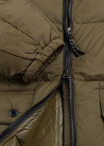 Gesteppte Jacke von Taion, Stehkragen mit Kapuze mit Tunnelzug, Zwei-Wege-Reißverschluss, lange Ärmel mit elastischen Bündchen, Pattentaschen mit Druckknöpfen, gerader Saum Tunnelzug, gefütterte Bearbeitung.