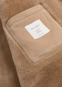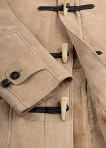 Butterweicher Shearling Mantel von Rifugio, Kapuze mit Riemen, Duffle-Coat Verschluss mit Hornknöpfen, aufgesetzte Pattentaschen, gerade Ärmel mit Riegel, Innentasche, Innenfutter aus Shearling.