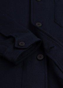 Strukturierte Hemdjacke von KnowledgeCotton aus weicher Merinowolle, klassischer Kragen,  Knopfleiste, lange Ärmel mit Knopfmanschette, drei aufgesetzte Taschen, teilgefütterte Verarbeitung, gerader Saum.