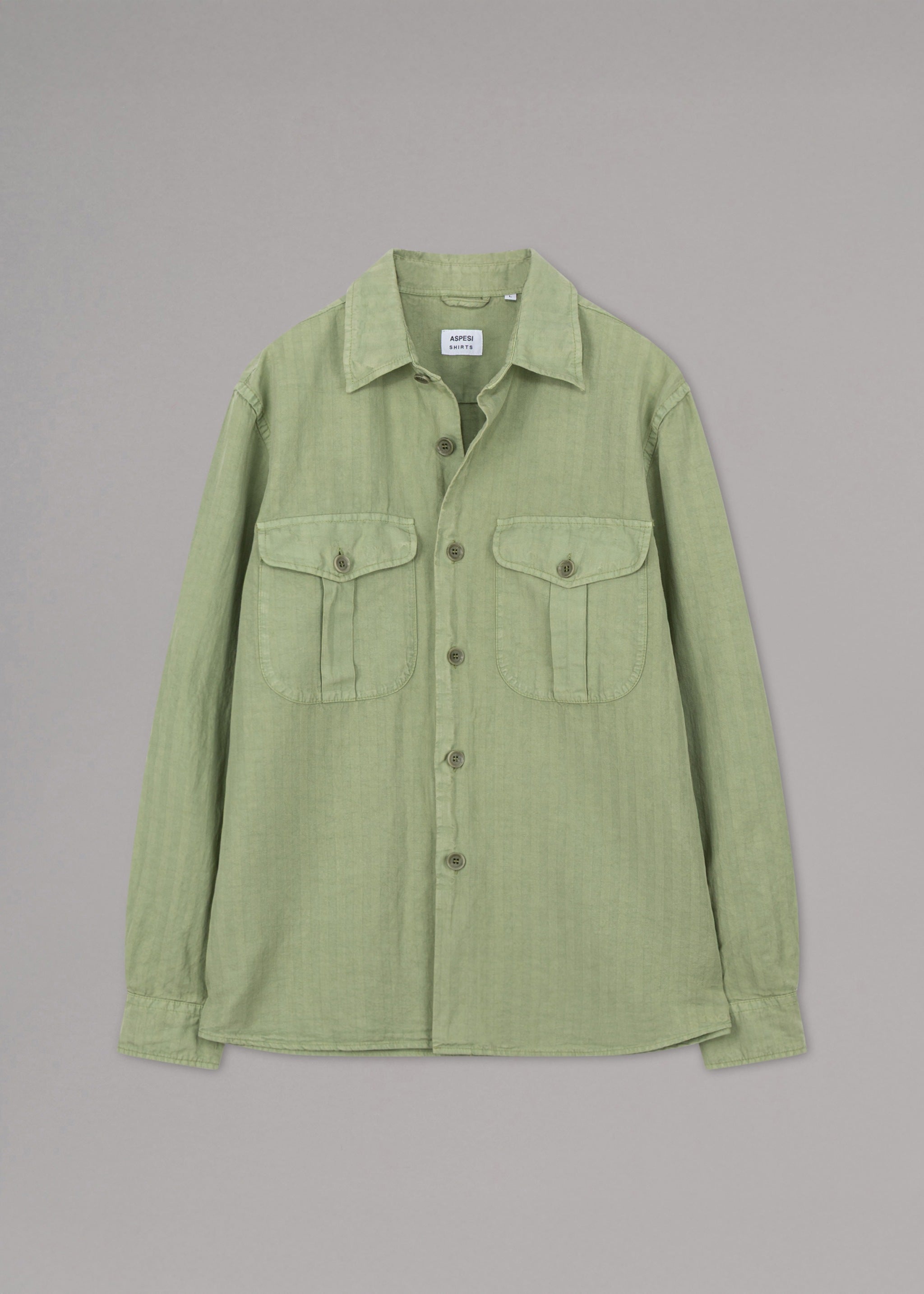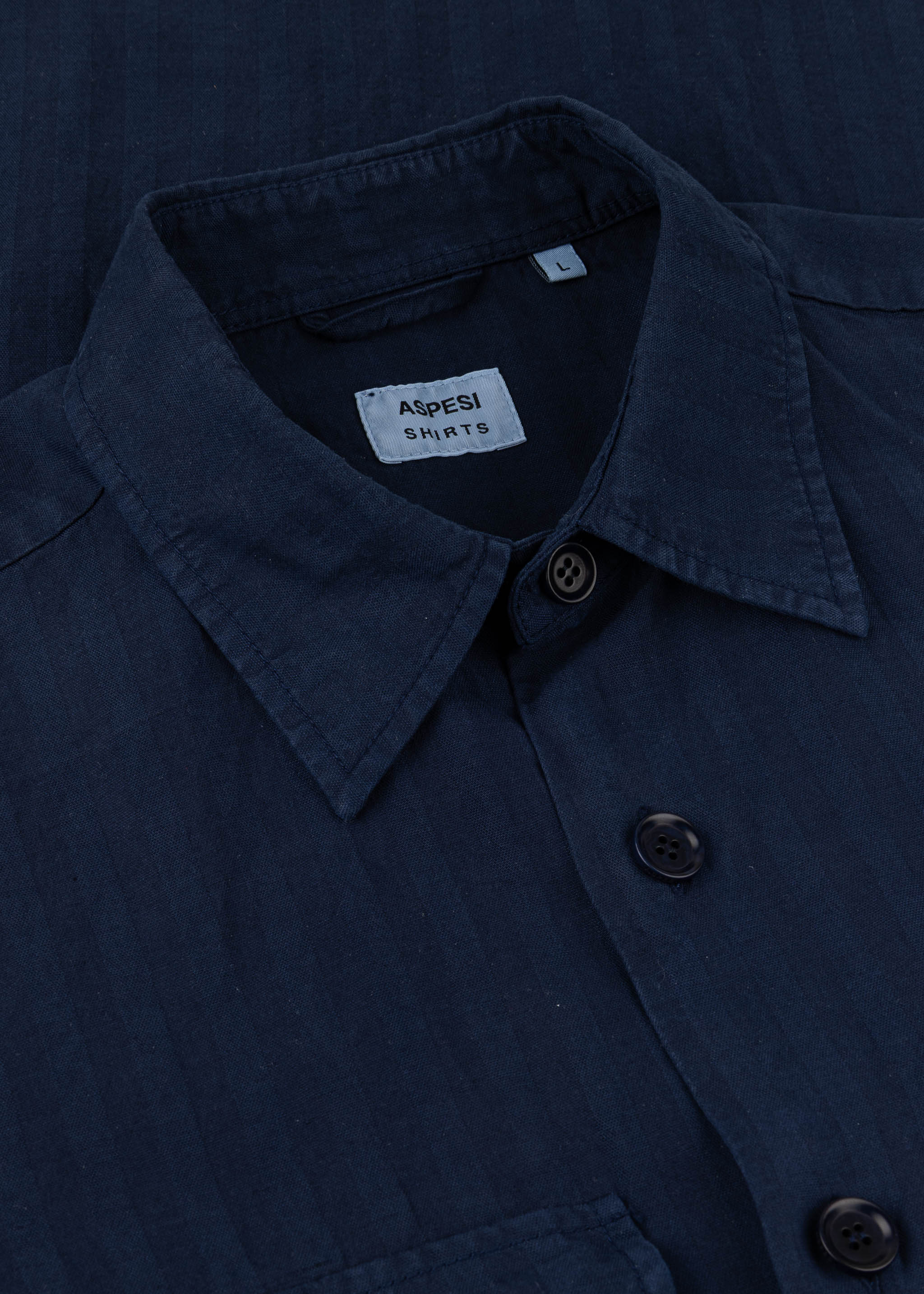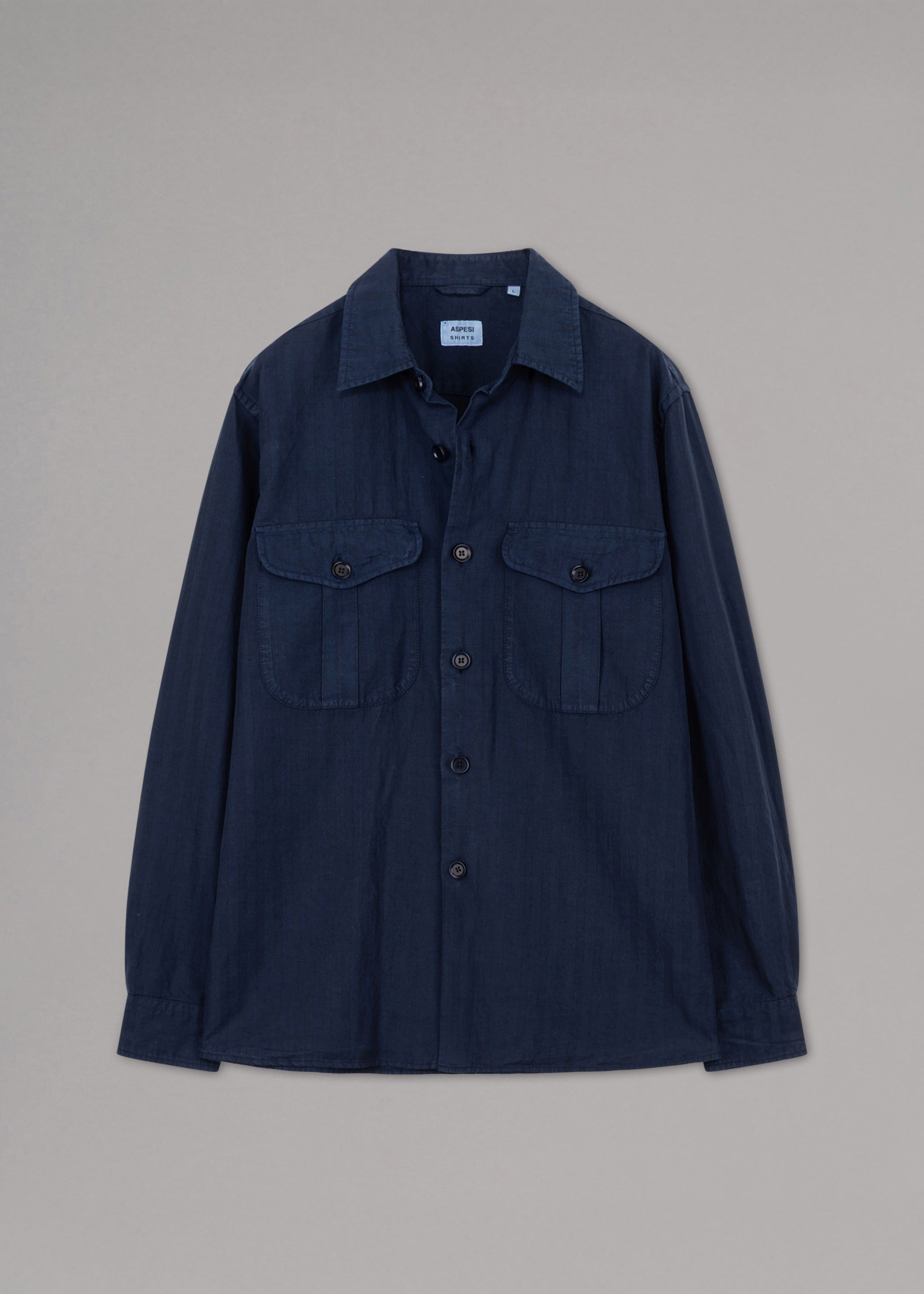 Lässiges Utility-Hemd von Aspesi aus feinem Materialmix, Ton-in-Ton Streifen, klassischer Kragen, lange Ärmel mit Knopfmanschetten, zwei Brusttaschen mit Patte, Knopfleiste, gerader Saum, weicher Griff.