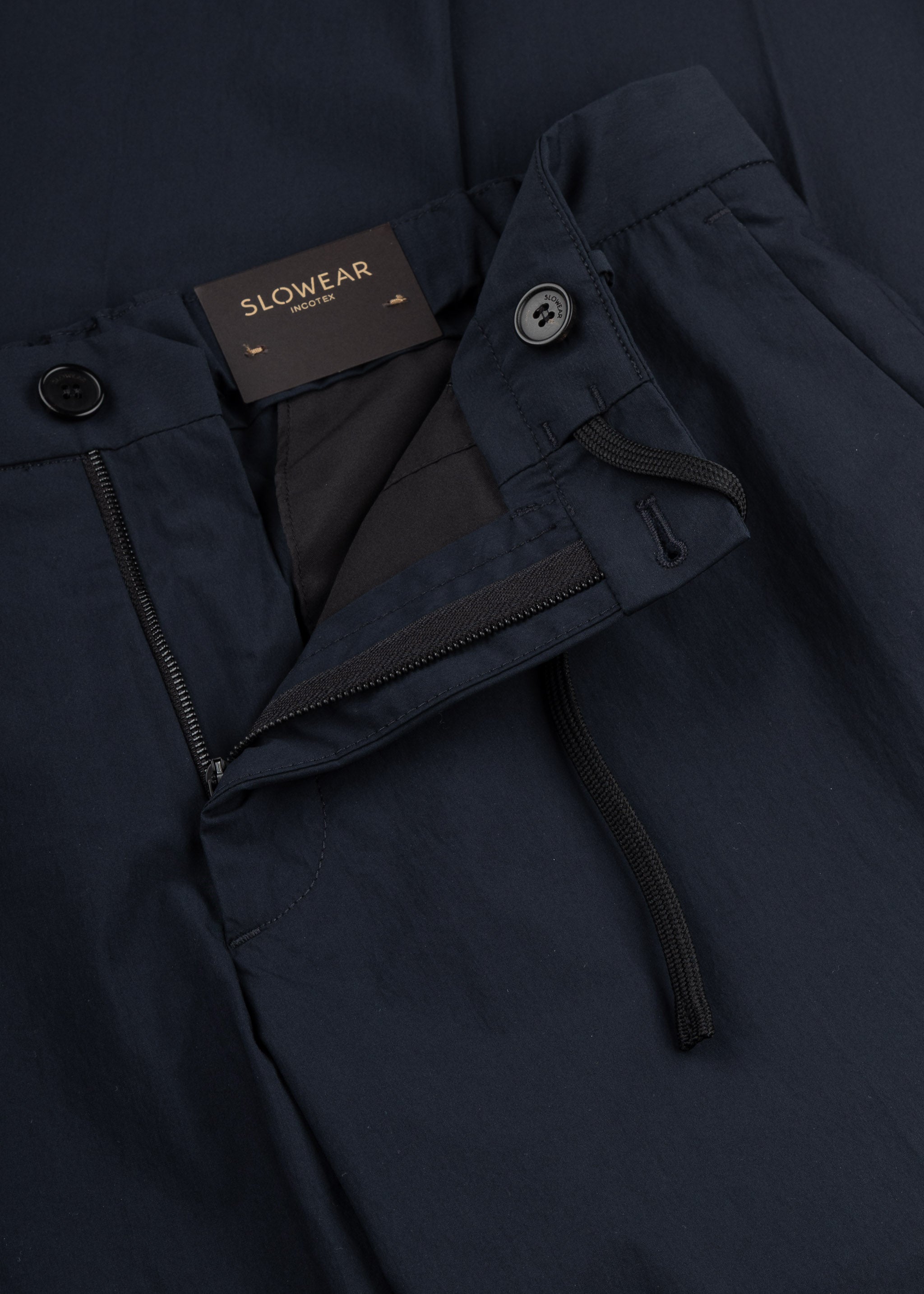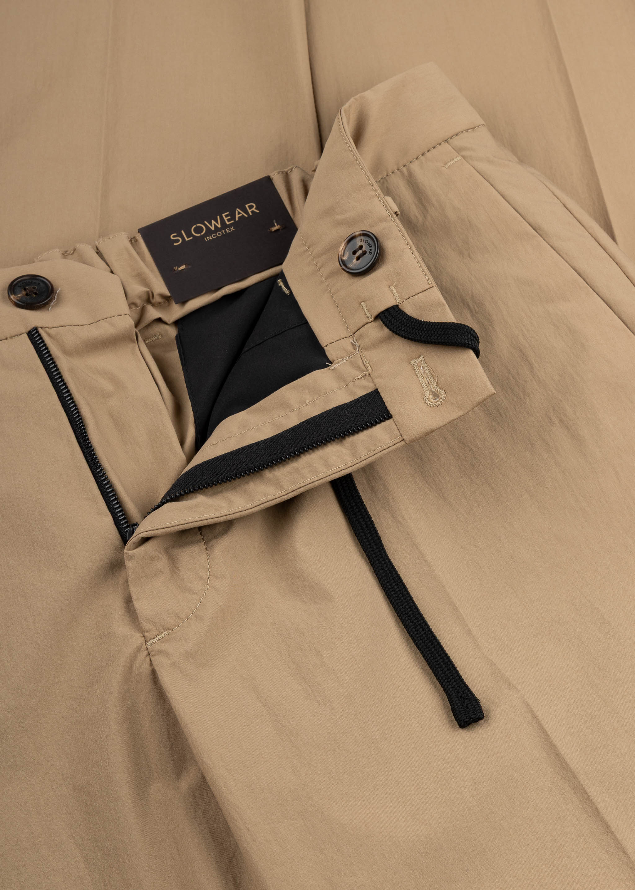 Superleichte Hose von Incotex aus knitterfreiem Material, elastischer Bund mit Tunnelzug, Gürtelschlaufen, Knopf- und Reißverschluss, Bügelfalten, Eingriffstaschen, Paspelgesäßtaschen, offener Beinsaum zur individuellen Längenanpassung.