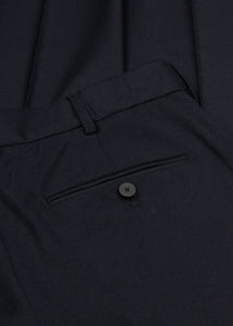 Dunkelblaue Hose 'Cambridge' von Cellar Door aus einem Wolle-Kaschmir Gewebe elastischer Bund, Eingrifftaschen, Paspeltaschen mit Knopf hinten, Bein mit Stulpe und schließt mit Reißverschluss und Haken.