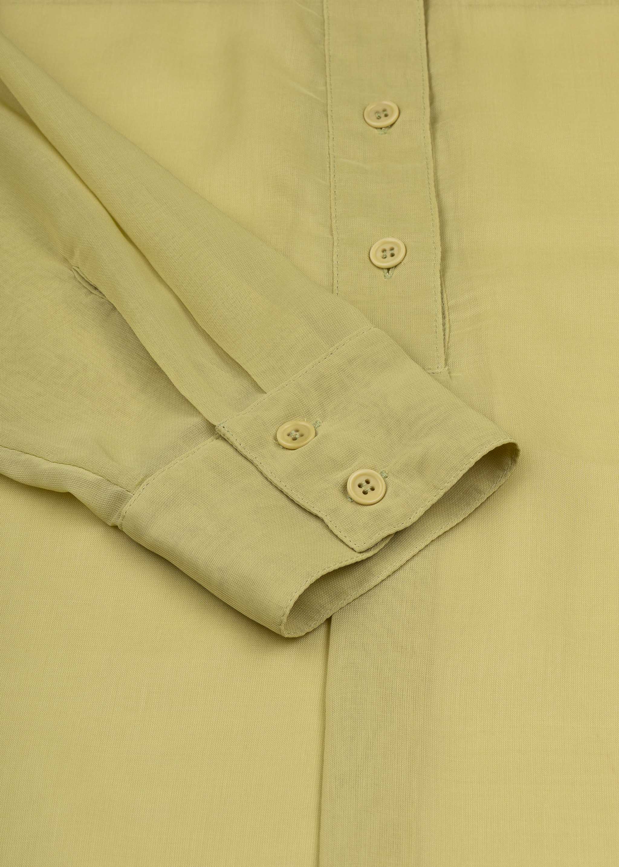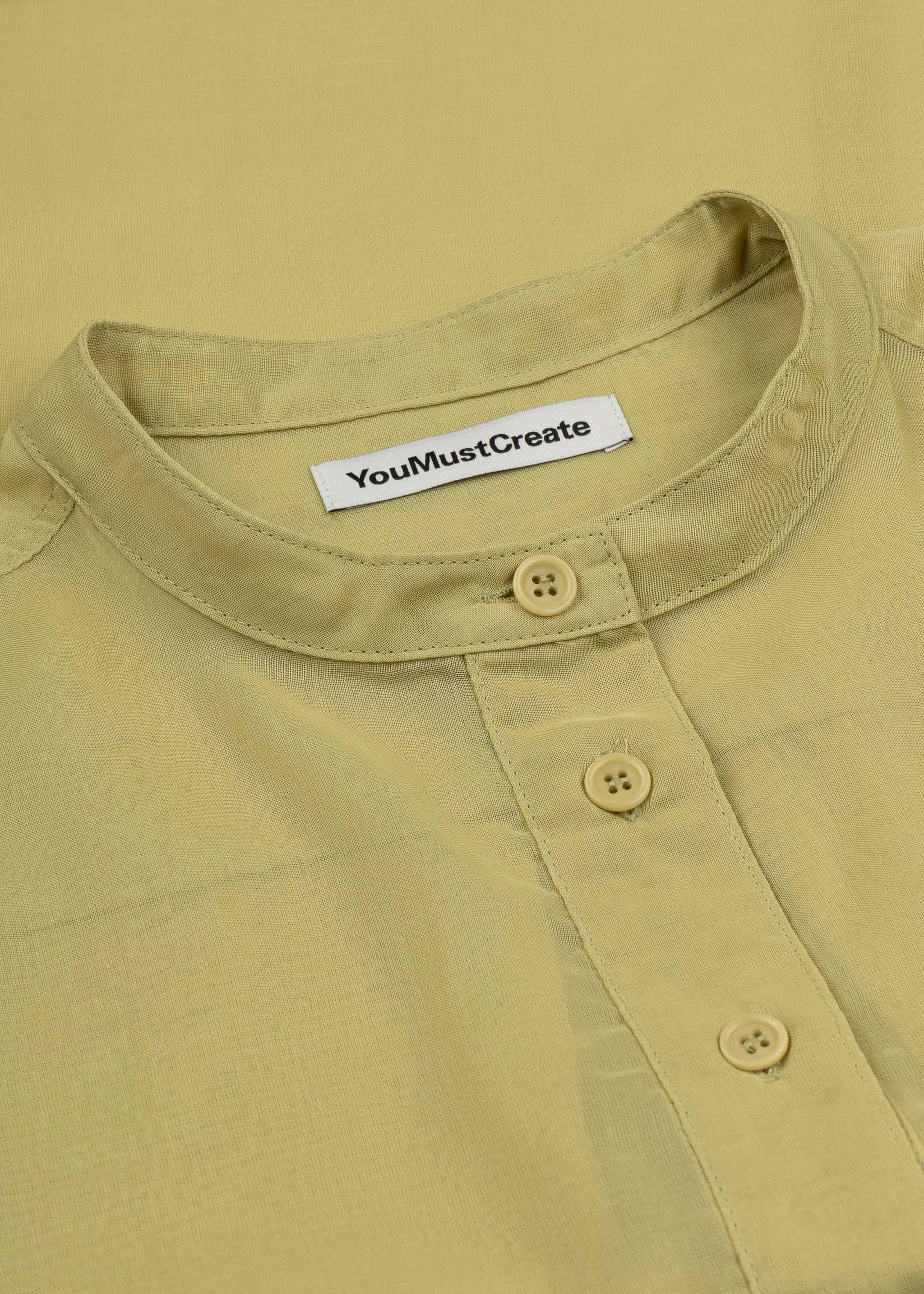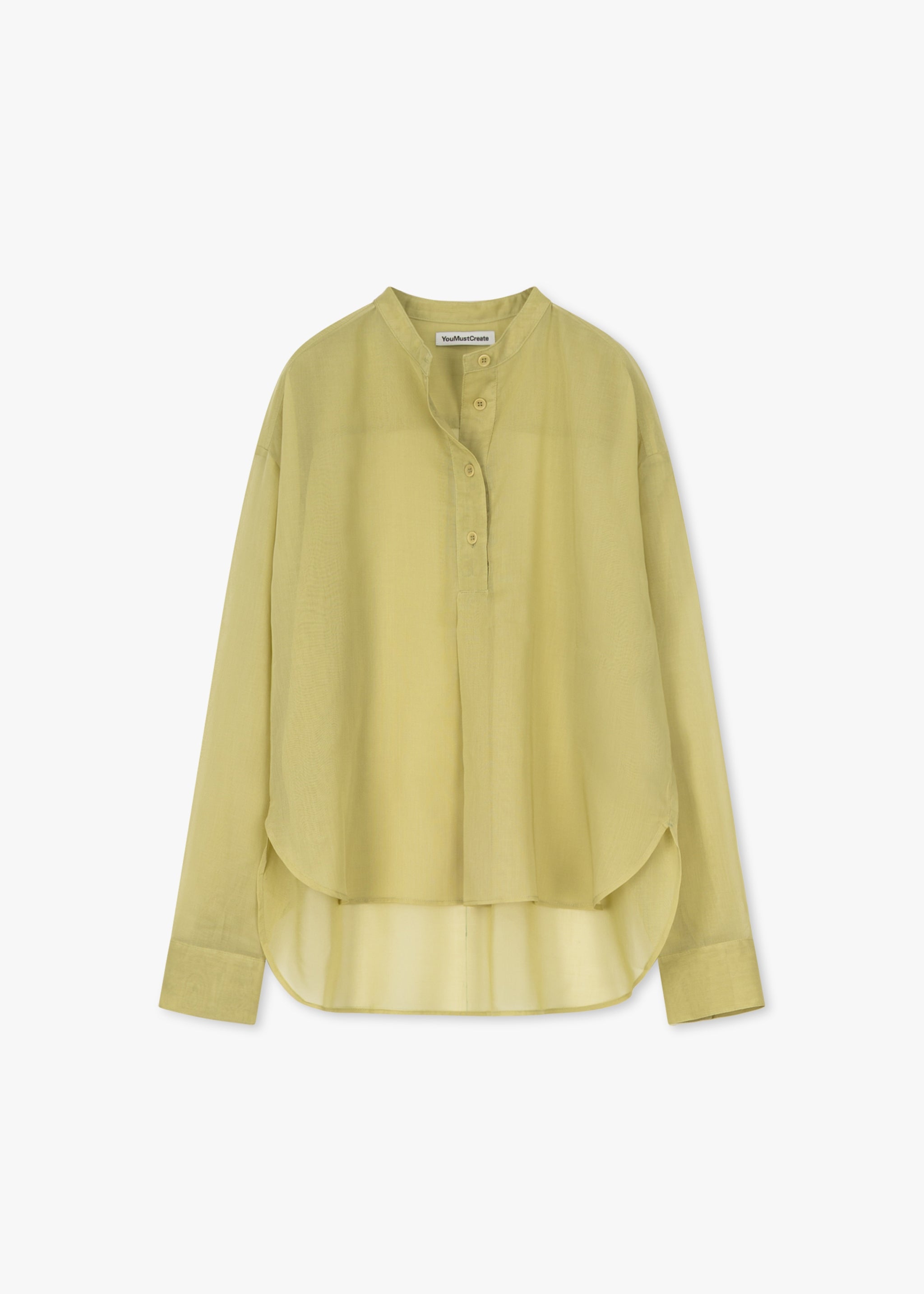 Fließende Bluse von YMC, Rundhals, kurze Knopfleiste, lange Ärmel mit Knopfmanschette, überschnittene Schultern, Rückenpasse mit Quetschfalte, abgerundeter Saum, verlängertes Rückenteil.