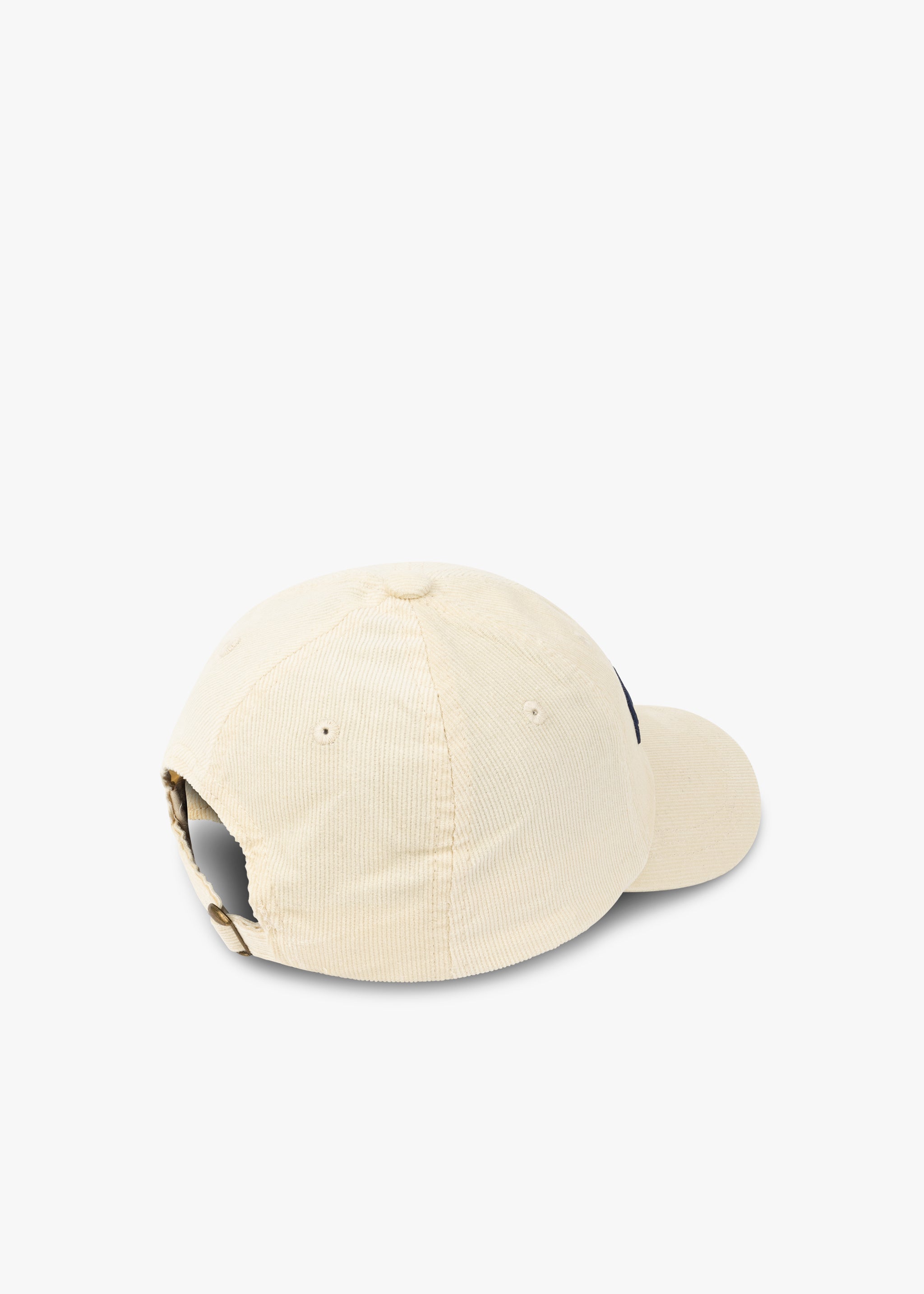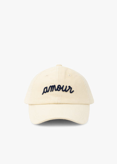 6-Panel-Cap von Maison Labiche aus Kord, 'amour' Stickerei, verstellbare Schnalle hinten.
