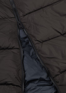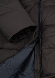 Langer Mantel 'Aranda' von Ecoalf aus recyceltem Polyester, Stehkragen mit Kapuze, lange Ärmel mit elastischen Bündchen, Zwei-Wege-Reißverschluss, innere Schulterträger, Eingriffstaschen mit Zip, eine Innentasche mit Zip, gerader Saum mit langen Seitenschlitzen und Zip, PrimaLoft® Isolierung, gefütterte Verarbeitung.