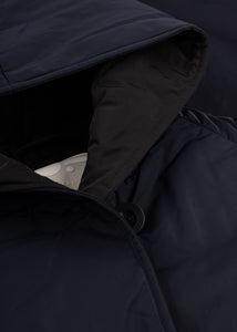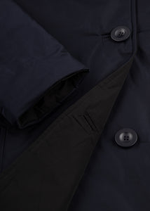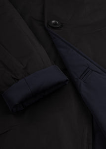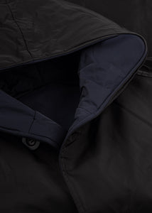 Mantel zum Wenden von ÖÖF Wear, Schalkragen mit Kapuze, Knopfleiste, Raglanärmel, aufgesetzte Taschen außen, Eingriffstaschen innen, Logo-Patch, gerader Saum, gefütterte Verarbeitung.