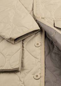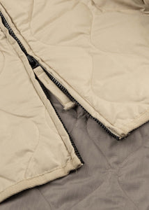 Leichter Daunenmantel von Taion, Kapuze mit Kordelzug, Rundhalsausschnitt, durchgehende Knopfleiste, leicht überschnittene Schultern, lange Ärmel, seitliche Reißverschlüsse für zusätzliche Belüftung, gerader Saum.