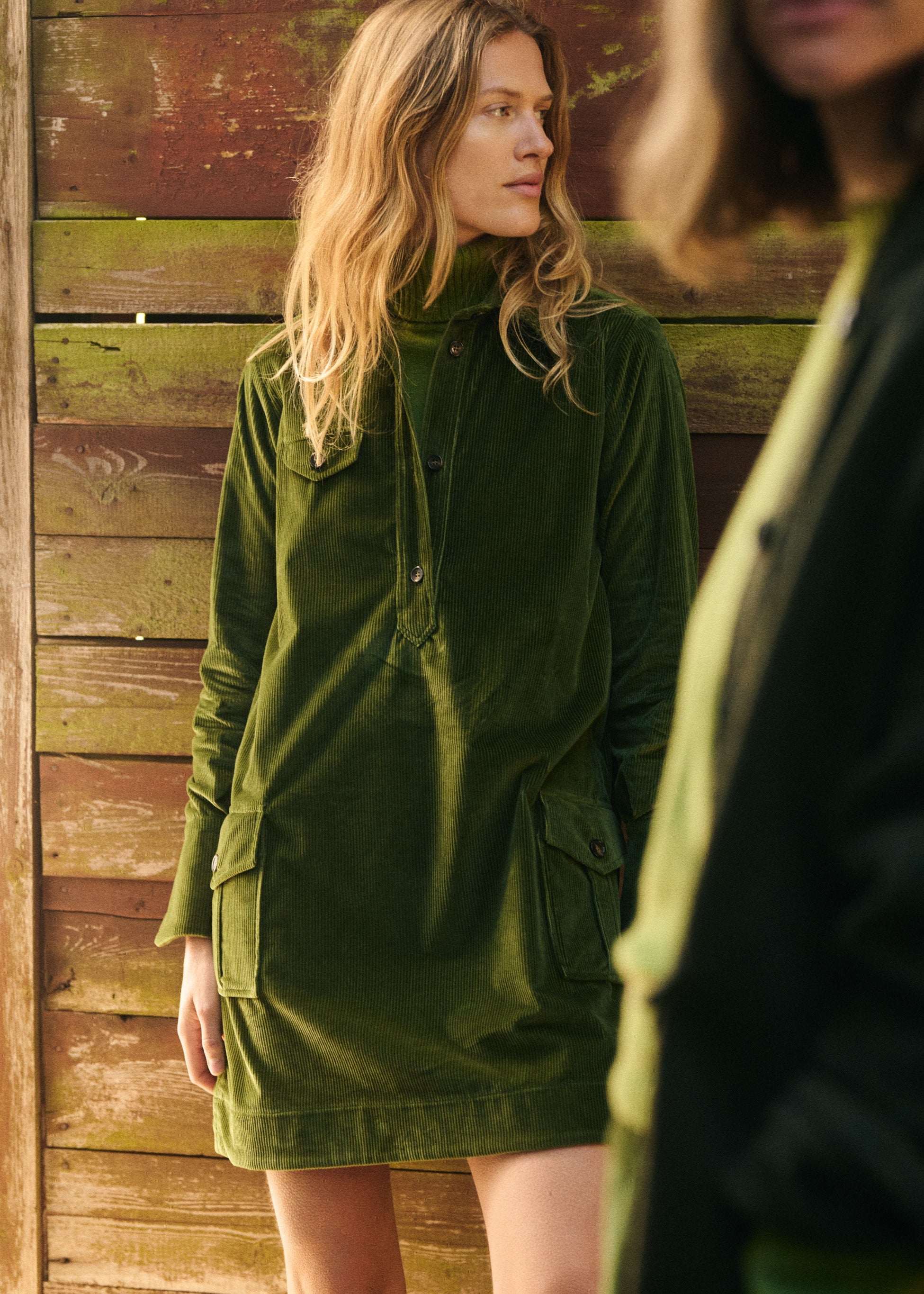 Midi 'Polo Dress' von PiaLea aus weichem Kord, klassischer Kragen mit Knopfleiste, lange Ärmel mit Knopfmanschette, Rückenpasse, angedeutete Brusttasche, zwei aufgesetzte Taschen, gerader Saum.