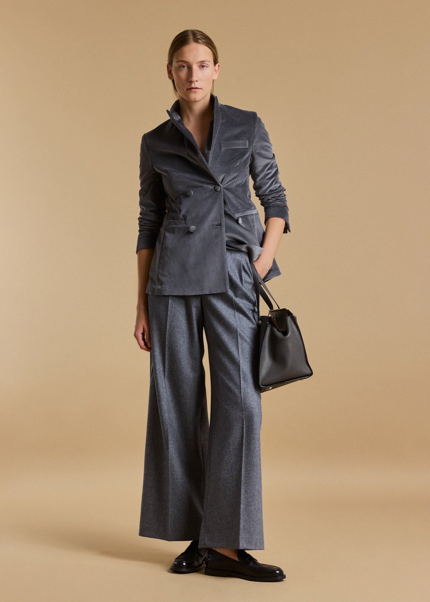 Doppelreihiger Blazer 'Theda' von Carlo Piombo aus Samt, steigendes Revers, lange Ärmel mit Knopfmanschette, Brusttasche, zwei Paspeltaschen, Gehschlitz im Rückenteil, teilgefüttert, gerader Saum.