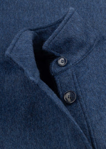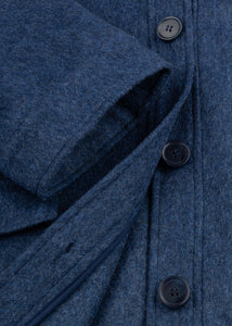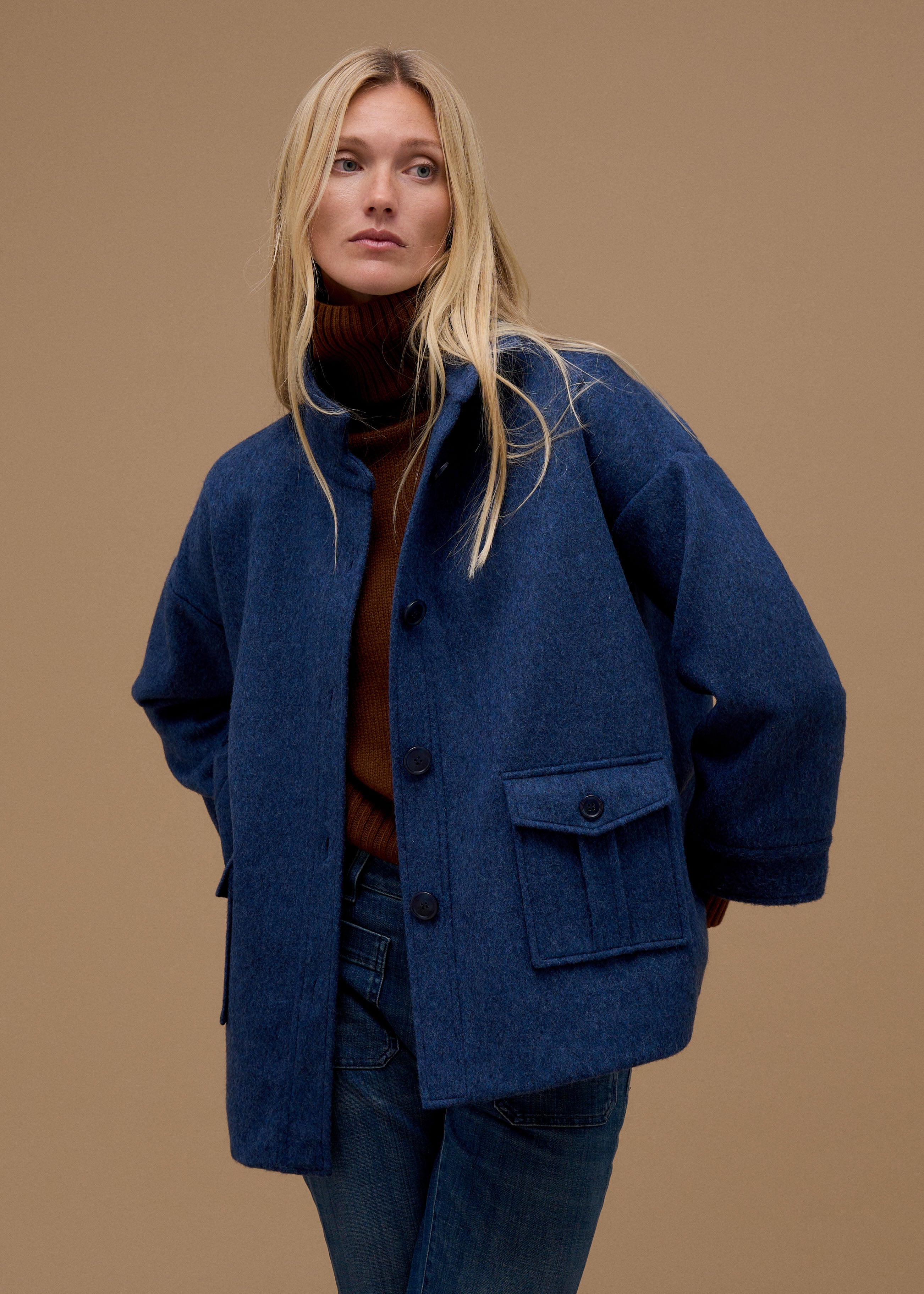 Jacke von PiaLea aus schwerem Loden, klassischer Kragen, überschnittene Schulter, lange Ärmel, Rückenpasse mit Kellerfalte, durchgehende Knopfleiste, zwei aufgesetzte Taschen mit Patte, gerader Saum, ungefütterte Verarbeitung.