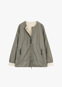 Wendejacke von Taion, eine Seite besteht aus gestepptem Nylon, die andere Seite aus glattem Nylon, Rundhalsausschnitt, Zwei-Wege Reißverschluss, zwei Eingrifftaschen und chinesische Knöpfe (gesteppte Seite), zwei Seitentaschen mit Reißverschluss (glatte Seite), gerader Saum.