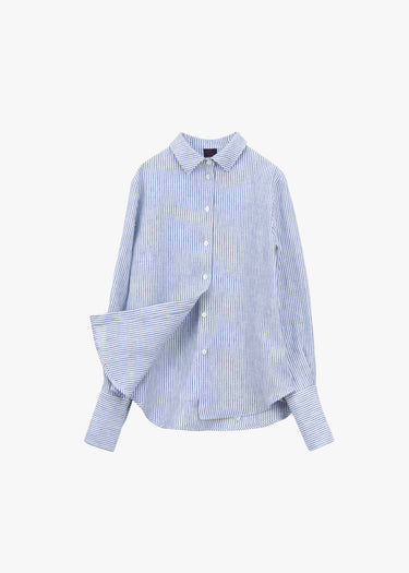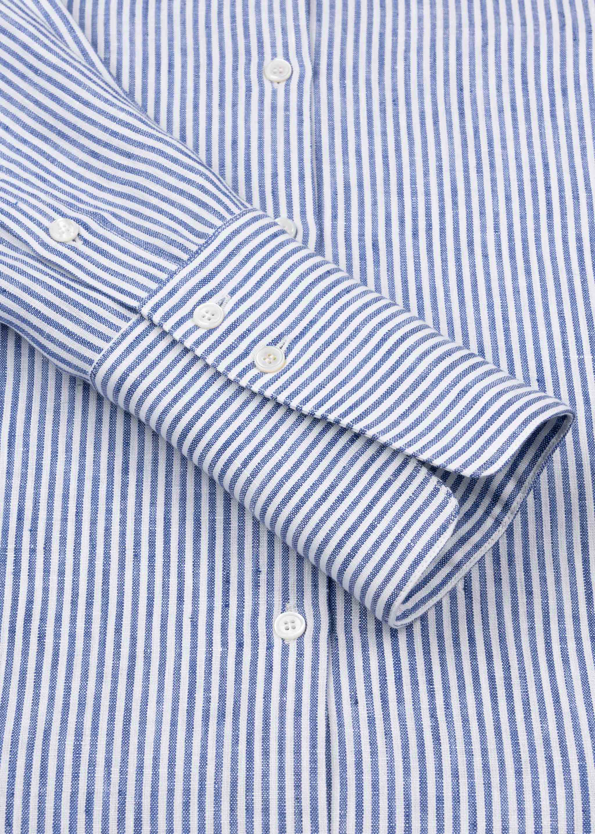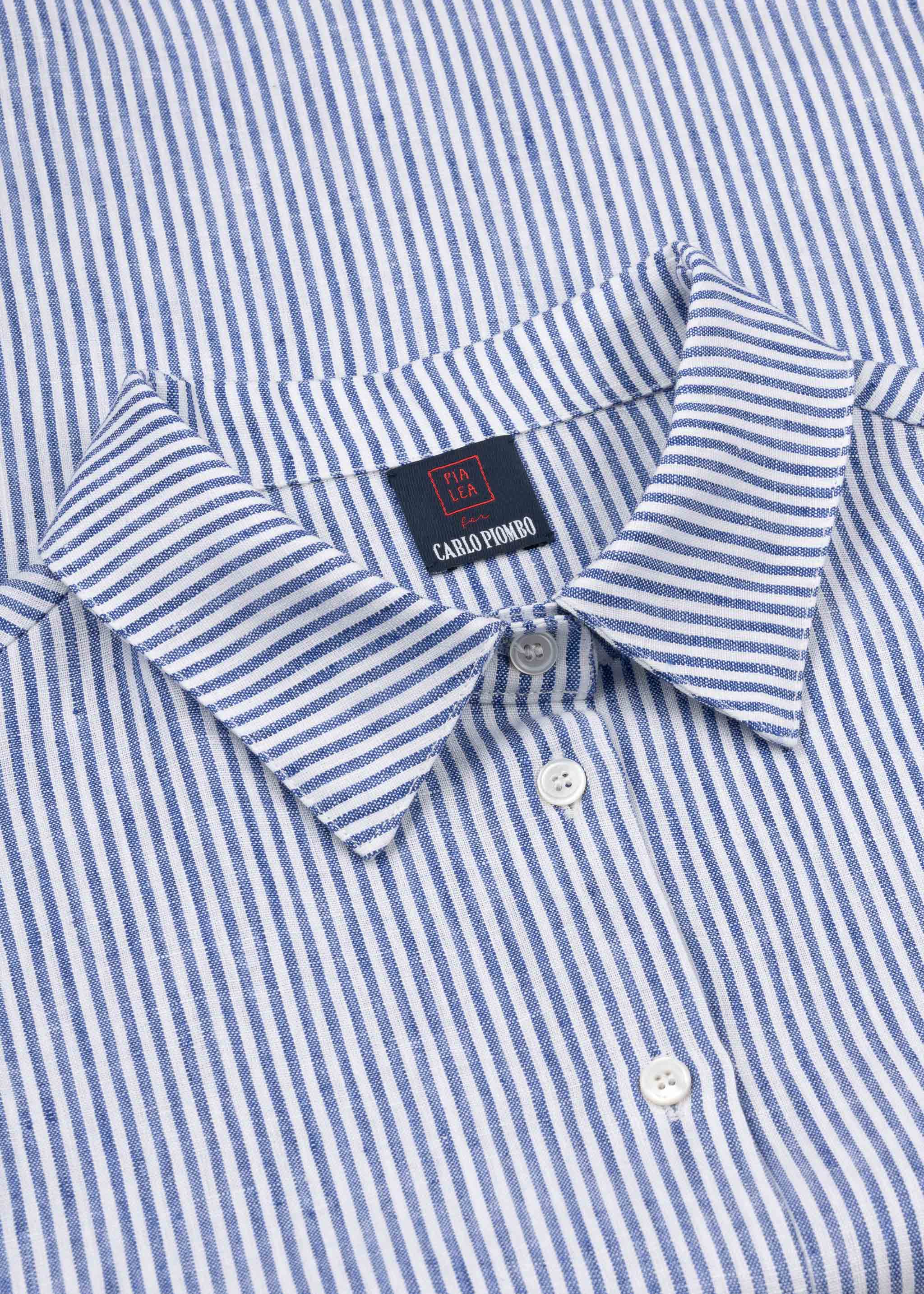 Gestreifte 'Woman Blouse' von Pialea aus Leinen, klassischer Kragen, lange Ärmel mit breiter Knopfmanschette, leicht abgerundeter Saum.