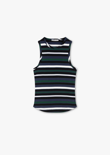 Geripptes Top 'Rainshine' von YMC aus Bio-Baumwolle, Rundhalsausschnitt, ärmellos, Kurzärmel, körperbetont, abgerundeter Saum.