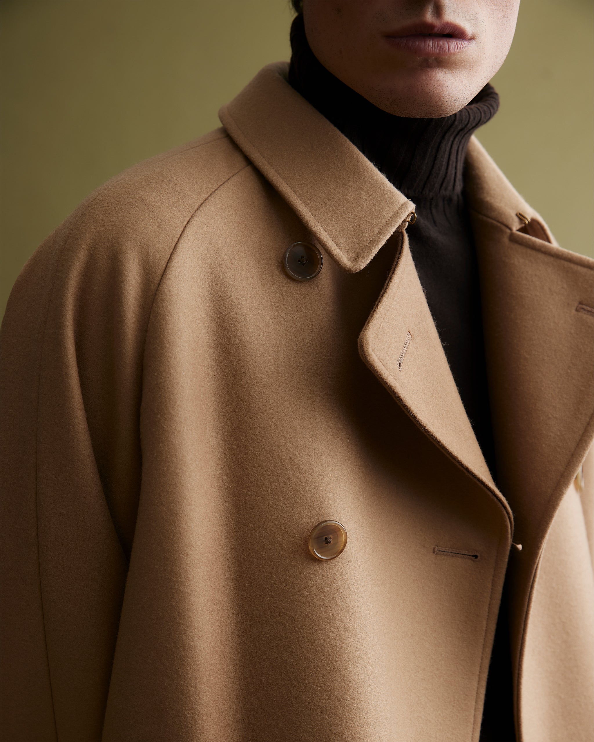 Zweireihiger Mantel von Cohérence, klassischer Kragen mit Haken, seitliche Eingrifftaschen mit Knopf, Knopfverschluss vorne, lange Ärmel mit jeweils zwei Knöpfen, ein Schlitz hinten und zwei Innentaschen.